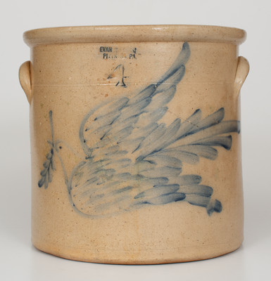 Exceptional Four-Gallon Stoneware Crock with Cobalt Dove Decoration, Stamped "EVAN R. JONES / PITTSTON, PA," circa 1875, cylindrical crock with tooled shoulder, semi-rounded rim, and applied lug handles, brush-decorated with a large design of a flying dove with olive branch in its beak. Elaborate feather detail throughout bird. Cobalt highlights to maker's mark and capacity mark. This crock is the only example of stoneware from the Central Pennsylvania potting tradition that we have seen featuring this design. Some scattered restored exfoliation to front involving some of decoration. Some additional minor exfoliation to shoulder on front. Two Y-shaped surface lines to front, measuring 5 1/2" and 3", not visible on interior. Two surface lines to right side of crock's front, measuring 4 1/4" and 2 3/4". Two additional surface lines to left side of crock, measuring 3 1/2" and 3", not visible on interior. Chips to interior of rim. H 11 1/4".