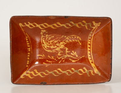 Rare and Fine Slip-Decorated Redware Loaf Dish with Bird Motif, Matawan, NJ origin, second quarter 19th century, rectangular dish with coggled edge, the interior decorated in yellow slip with a slip-trailed design of a crested bird with turned head and spotted tail, perched on an undulating vine, bordered by a wavy lines and spotted drape motifs. The overall style of the decoration indicates it was made in the town of Matawan, NJ, from which a body of bird-decorated redware dishes are known. Unusual to this work is its loaf dish form and different details to the bird, including a comb, wider wing, and wider, spotted tail, giving it the appearance of a rooster rather than a songbird. Knife marks from use on interior. A few minor flakes to interior. A 1 1/4" hairline from edge. Rim chips and a 7/8" chip to one corner, the latter primarily visible on reverse. Dimensions: 12 1/2" x 8 1/2".