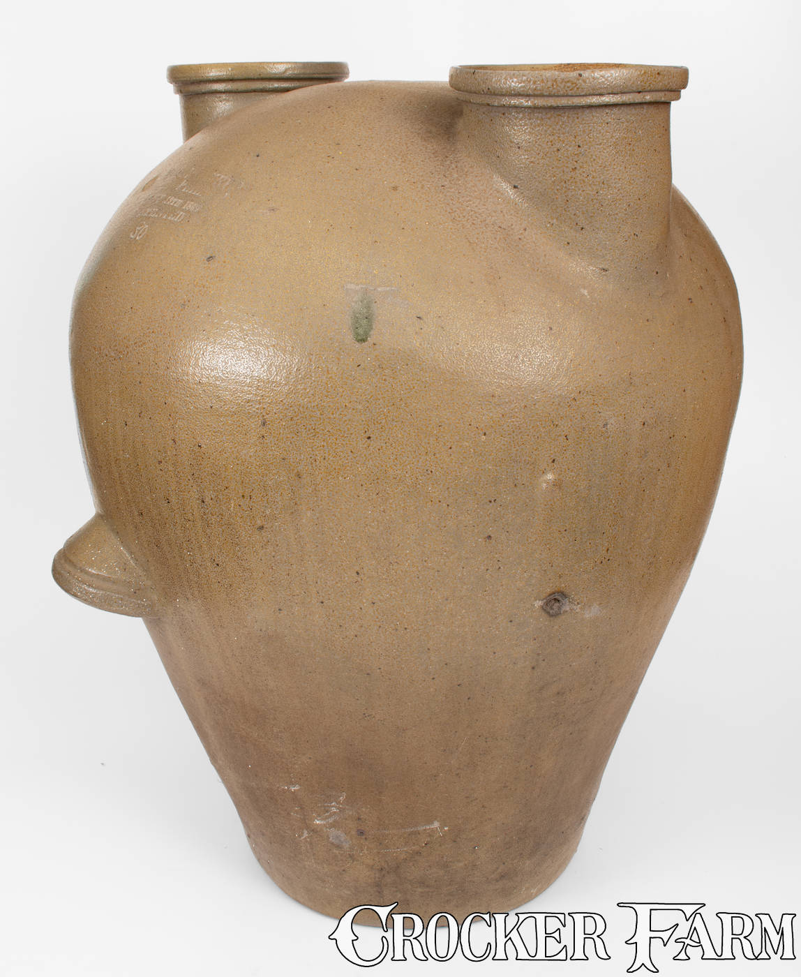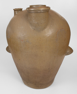 Exceedingly Rare Thirty-Gallon Salt-Glazed Chemical Stoneware Vessel, Stamped "R.C. REMMEY / PHILA / JAN'Y 12TH 1869 / PATENTED," Incised "30," Richard C. Remmey, Philadelphia, PA, circa 1870, massive, ovoid form the top fashioned with two wide, wheel-thrown and applied cylindrical spouts flanking a narrower spout, the midsection with deeply grooved, applied pocket handles. Incised at shoulder with the number, "30," for thirty gallons along with an elaborate impressed maker's mark and patent date for the form by renowned Philadelphia potter, Richard Clinton Remmey. Surface covered in a clear salt glaze. This sculptural work is one of the two largest known examples of Remmey family stoneware from America, the other being a similar example in the collection of the Smithsonian's National Museum of American History in Washington, D.C. The production of this work was a major undertaking, requiring two to three individually-thrown and connected sections to produce the body of the vessel, three individually-thrown and applied spouts, hollowing to the juncture of the spouts with the vessel, and modeling and application of its substantial handles. The completed product is a work of exemplary craftsmanship and refined, thin-walled potting, contradicting the piece's highly-utilitarian nature. Used for producing chemicals, related salt-glazed examples of this form are known from the Mid-Atlantic and later examples from Ohio. A thin 7" Y-shaped crack at base. One spout with a small chip and shallow 1 1/2" flake. Another spout with a small chip. H 24 7/8".