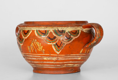 Outstanding Slip-Decorated Redware Sugar Bowl, Mid-Atlantic or Southern U.S. origin, possibly Peter Bell, Winchester, VA or Hagerstown, MD, circa 1815-1825, ovoid form with footed base, applied strap handles, and short, vertical rim, decorated on the front and reverse with a "fish scale" or "grape cluster" motif in slip-trailed white, copper, and manganese slip. Bottom half of jar decorated with circumferential white-slip lines surmounted by unusual yellow-slip swags. Handles decorated with copper and white slip swags along with yellow-slip swags below. Interior and exterior coated in a clear lead glaze. The profuse application of slip on this example, executed in four different colors, is noteworthy. Provenance: Jeffrey S. Evans and Associates, June 2013. Chipping to base. Wear to slip. A few minor chips to horizontal rim molding and wear to rim and handles. Exfoliation to interior base and some scratches to interior wall. H 5" ; Diam. (at rim) 7 1/4".