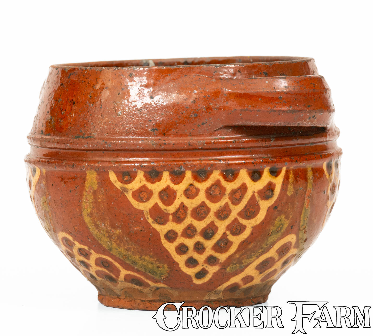 Very Fine Small-Sized Slip-Decorated Redware Sugar Bowl, possibly Peter Bell