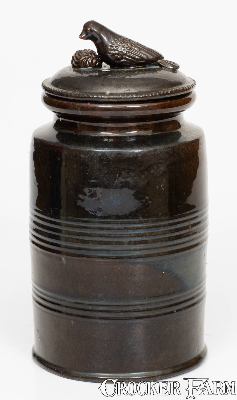 Redware Bird-Finialed Lid w/ Associated Jar, attrib. Anthony Baecher, Adams County, PA, c1855