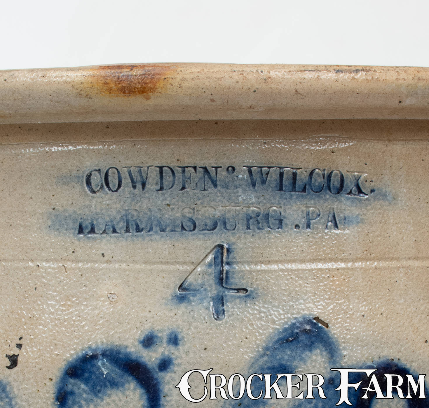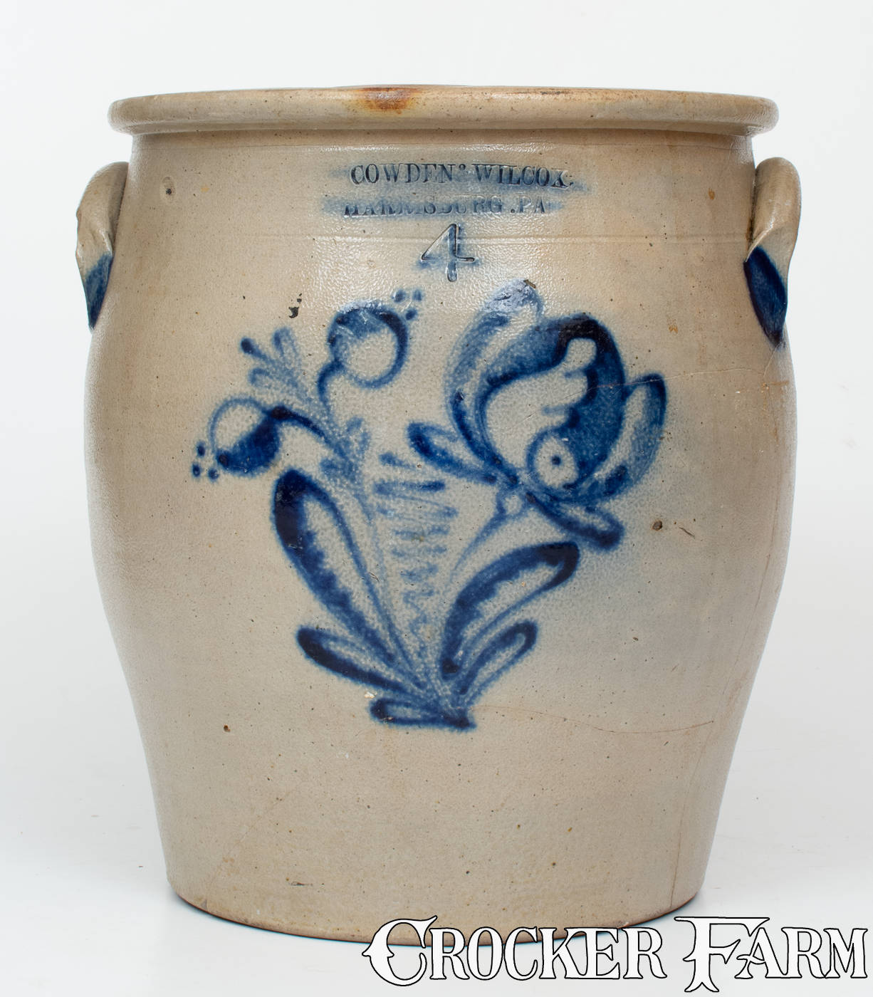 Rare Four-Gallon Stoneware Jar with Elaborate Cobalt Floral Decoration, Stamped "COWDEN & WILCOX. / HARRISBURG .PA," circa 1865, ovoid jar with tooled shoulder, flattened rim, and applied lug handles, decorated with a slip-trailed design of a flowering plant in the style of Rochester, New York potter, John Burger, depicting a large blossom and two berries emanating from a group of leaves. Cobalt highlights to maker's mark, capacity mark, and handle terminals. Desirable, lesser-seen slip-trailed treatment and unusual design inspired by one of the nation's leading potters. Very large reglued section at base. Cracks and small chips in underside, including a small, sliver-shaped loss that extends through to interior. A very large Y-shaped crack to side of jar, emanating from underside. A minor, glazed-over iron ping below rim on front. An approximately 6" x 5" X-shaped line to reverse. A glazed-over 1 1/8" chip to one handle. Some minor in-the-firing pings to surface. Water glass staining to interior. Minor staining to exterior. H 13".