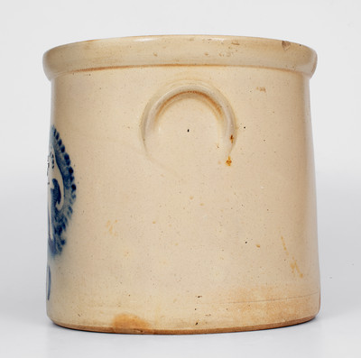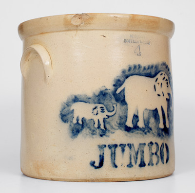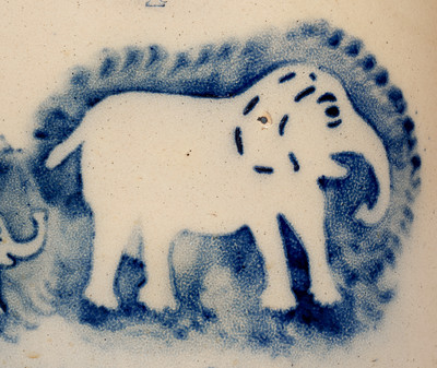 Outstanding Four-Gallon Cobalt-Decorated Stoneware Crock with Stenciled Elephant Motifs, Inscribed "JUMBO," Stamped "SOMERSET / POTTERS WORKS," Somerset, MA, circa 1882, cylindrical crock with semi-rounded rim and applied lug handles, decorated with a stenciled design of a large elephant followed by a small elephant with upturned trunk, both surrounded by heavy cobalt brushwork. Inscribed below in large stenciled letters, "JUMBO." Cobalt highlights to maker's mark and capacity mark. This wonderfully-decorated crock commemorates P.T. Barnum's famous circus elephant, Jumbo (1860-1885), who Barnum purchased from the London Zoo for $10,000 and first exhibited in America in 1882. Jumbo, billed as the largest elephant in the world, was so popular that he earned Barnum his money back in three weeks. The term, "jumbo," is used to this day to describe things of an exceptionally large size. The smaller elephant presumably depicts Tom Thumb, a young elephant that Jumbo worked with. Jumbo tragically died after being hit by a train in St. Thomas, Ontario, Canada in 1885. According to Barnum, Jumbo was in the process of leading Tom Thumb away from the railroad tracks to avoid the oncoming train when both elephants were struck and mortally wounded. Newspaper accounts, however, stated that Tom Thumb only suffered a broken leg. Elephants are among the rarest animals represented with any regularity in the American stoneware medium. This example combines the high visual appeal of this motif, executed in strong color, with the historical significance relating it to one of America's most famous, larger-than-life circus performers. The few surviving pieces bearing this iconic stenciled design are regarded as the finest creations known from the Chace family's Somerset Potters Works. A 1 1/4" chip to front of rim, a small rim chip on reverse, and a few rim nicks. Several small chips to interior of rim. A small in-the-firing ping to elephant's ear. H 11 1/2".