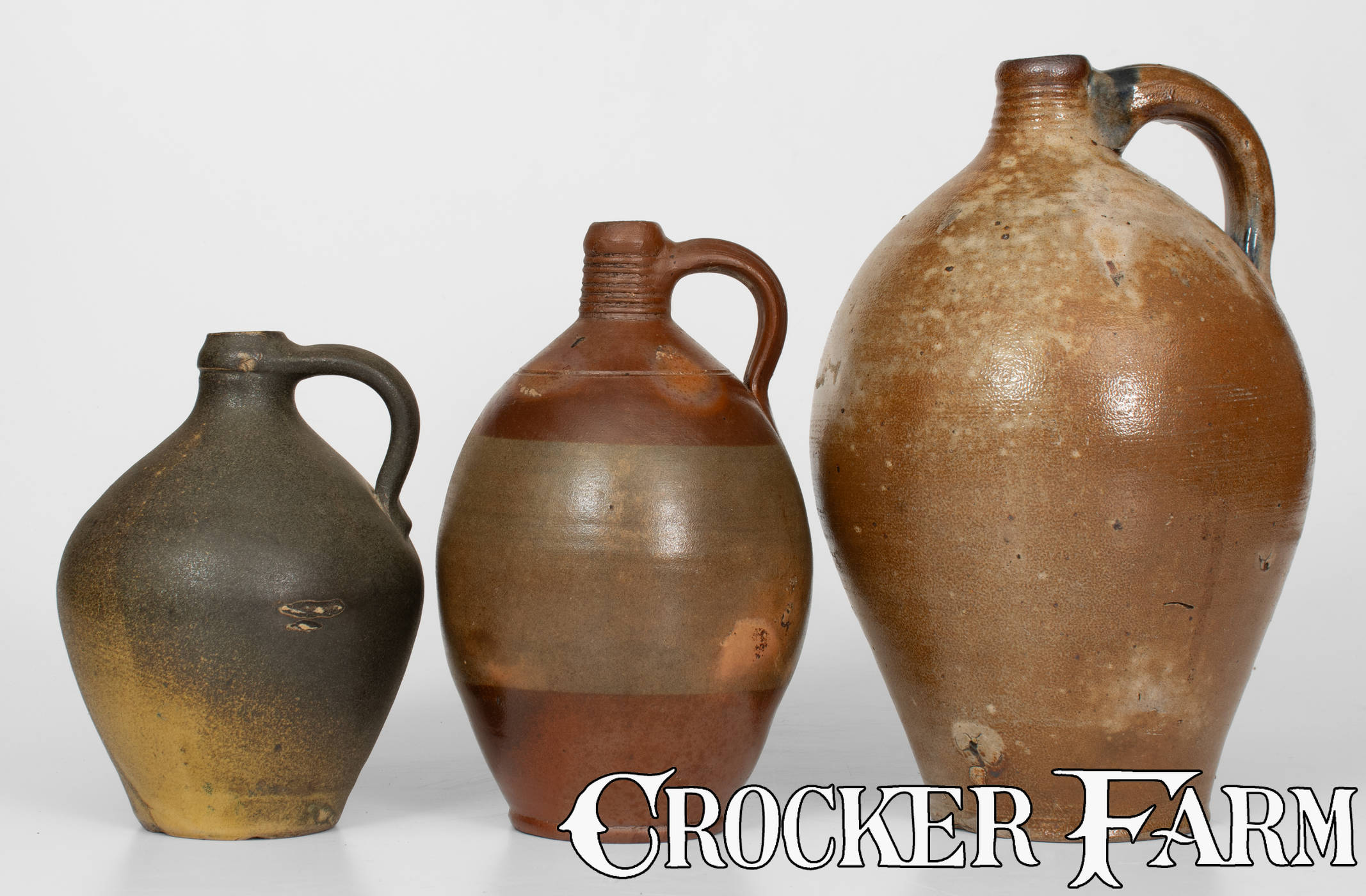 Three Northeastern U.S. Stoneware Jugs, first quarter 19th century, an ovoid jug with heavily-tooled spout, decorated with dipped iron-oxide to the upper and lower body under a light salt glaze, attributed to Frederick Carpenter, Charlestown, MA, early 19th century; an Albany-slip-glazed jug, probably NY State origin, circa 1825; and a one-gallon ovoid jug with heavily-tooled spout spout, cobalt-decorated handle terminals, and salt-glazed surface, CT origin, early 19th century. Literature: Tallest illustrated in "Stoneware, Prized Ware of Old Time Potters," Encyclopedia of Collectables, Time-Life Books, 1980, p. 136. Iron-dipped jug with a chip to interior of spout, in otherwise excellent condition. Smallest with in-the-firing chips to bottom edge and an in-the-firing contact mark to side of jug. Tallest with base chips, some typical in-the-firing pings and flaws to surface, and an in-the-firing, the handle with a glazed-over chip with iron inclusion. H (of iron-dipped jug) 9 1/2".