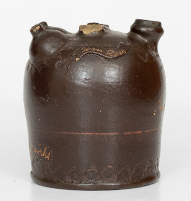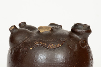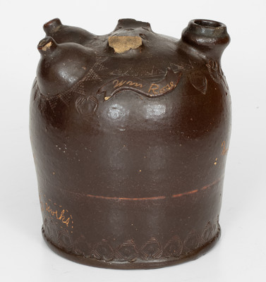 Extremely Rare Albany-Slip-Glazed Stoneware Triple-Spouted Harvest Jug, Inscribed "Old Rye Whiskey / Second Amendment Jug / Nov 27th 1883 / Wm. Rose," Signed "Christy town Pottery Works," Christytown, Mahoning County, OH origin, 1883, beehive-shaped form with a wide pouring spout to one side and two applied narrow pouring spouts in the form of stylized breasts to the opposing side. Surface covered in an Albany slip glaze, featuring the sgraffito inscriptions, "Old Rye Whiskey" and "Christy town Pottery Works," within a dashed border on the front, "Second Amendment Jug," on the side of the vessel, and the date, "Nov 27th 1883," on the reverse. An applied clay banner on the opposing side is incised "Wm Rose," probably the same William Rose who appears as a young farm laborer and next door neighbor of one of the Christytown potters in the 1870 census. The surface is further embellished with impressed inverted hearts around the base and shoulder, impressed crosshatched triangles around the breast-form spouts, faux screwheads and drapes around the larger spout, and additional faux screwheads at the center of the handle. The underside is whimsically incised with the rear end of a man, which "moons" the viewer when the jug is tipped for drinking. A tour-de-force of ceramic folk art, this work was created as a humorous and provocative item designed to be seen as much as it was used. The inscription "Old Rye Whiskey" placed below a Christian cross (at a time when the Temperance Movement was in full swing), the slogan, "Second Amendment Jug," the breast-shaped spouts, and the incised rear end on the underside, all point to a clever, social commentator as much as a skilled potter. The bawdy elements of the jug are highly reminiscent of the famous pig bottles, shoo fly jugs, and various political ware of the Kirkpatrick Brothers of Anna, Illinois, working during the same time period. Provenance: Featured on the PBS series, Antiques Roadshow, Cleveland, OH, 2015. Missing handle. Flakes and chips to underside at edge, which appear to have occurred during the firing. Small chips to one smaller spout. Minor nicks to applied banner. A chip and minor glaze-over chip to larger spout. H 7 3/8".