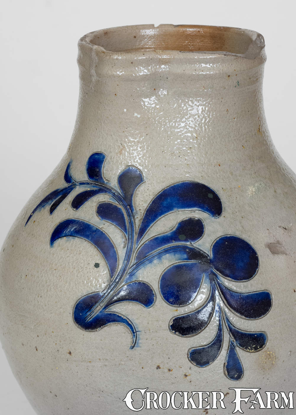 Extremely Rare and Important Stoneware Pitcher with Incised Floral Decoration, attributed to Thomas Commeraw, Manhattan, NY, late 18th century, highly-ovoid pitcher with footed base and short, narrow collar with tooled rim, the front decorated with an incised and cobalt-highlighted floral design featuring a fan-shaped blossom and a series of leaves emanating from two stems drawn with a three-pronged stylus. Brushed cobalt highlights to handle terminals. Though unmarked, the decoration on this pitcher leads to a firm attribution to Thomas Commeraw, as this motif is found on a number of the potter's earliest works from Corlears Hook. The pitcher is one of a small body of pieces that we can confidently say Commeraw threw on the wheel and decorated himself. Among the best displays of Commeraw's potting ability to have surfaced, this vessel exhibits an expressive and curvaceous form uncommon to most Manhattan pitchers known. Of particular note is the remarkable color of the clay and cobalt used, characteristic of finer examples of 1790s stoneware produced by Commeraw at his Corlears Hook shop and at Pot Baker's Hill, where he learned the craft. Its early style and lack of maker's mark offers the possibility that it was made while he was still working with the Crolius family on Pot Baker's Hill, prior to the establishment of his independent shop in Corlears Hook a little over a mile away. Handle professionally restored by Thomas Restoration using a mold from a surviving Commeraw pitcher handle. A long, shallow in-the-firing flake to top of rim. A small rim chip on reverse with a 1 3/4" hairline descending from it. A 1 3/4" hairline to interior of rim, a very small part of which is visible on the exterior. Heavy chipping to base. H 10 3/4".