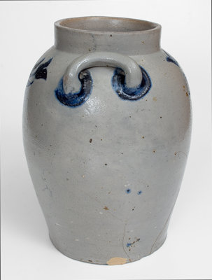 Very Rare Open-Handled Stoneware Jar with Incised Floral Decoration, Baltimore, MD origin, probably William Morgan, possibly in partnership with Thomas Amoss, circa 1820, ovoid jar with footed base, tall cylindrical collar, and depressed open-loop handles, decorated on the front and reverse with incised double-stemmed flowering plant motifs resembling bluebells or tulips. Cobalt highlights to incised decoration and handle terminals. Few examples of Baltimore stoneware with incised decoration are known. Significant sealed cracks in underside, including a 3 3/8" reglued piece on underside. One of the cracks on the underside continues up one of the decorated sides of the jar, forming a large Y. A 1 1/8" in-the-firing surface chip (contact mark) appears on the same side. A second Y-shaped crack extends from the underside to the midsection of the jar below one handle. A 1 1/4" filled section to base. A small glazed-over chip to interior of rim. H 14 1/2".