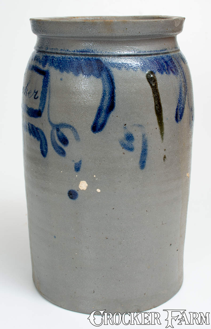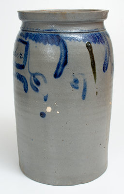 Very Rare Two-Gallon Stoneware Presentation Jar with Cobalt Floral Decoration, Inscribed "Thomas Loker," Baltimore, MD origin, circa 1840, cylindrical jar with tooled shoulder and semi-squared rim, featuring the incised and cobalt-highlighted name, "Thomas Loker," within a brushed cobalt slip border. Brushed swag-and-hanging-flower decoration around shoulder and swags below inscribed name. Thomas Loker (1798-1876) was a very prominent landowner in St. Mary's County, Maryland. This jar, clearly fashioned to be used in association with his vast holdings in the area, falls in line beside other well-known Baltimore-made plantation jars bearing names such as "Airville" and "White Marsh." Rim chips. A spider crack underside forming a 10 1/2" sealed vertical crack on front. A few salt drips to surface. Small traces old white paint. The notation, "II," was carved into the clay on the front after the firing. H 13 5/8".