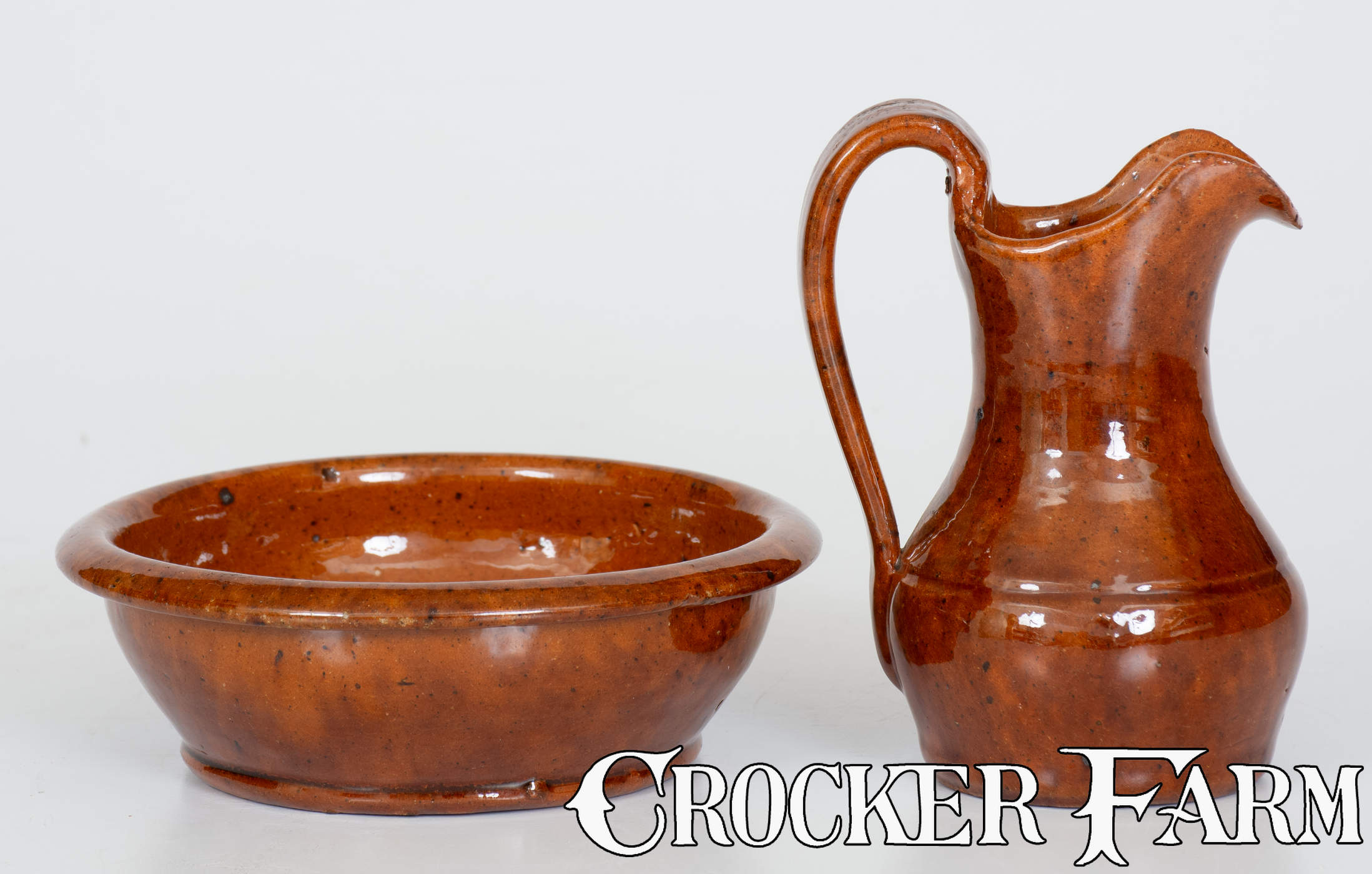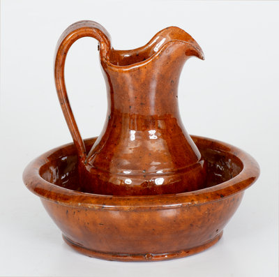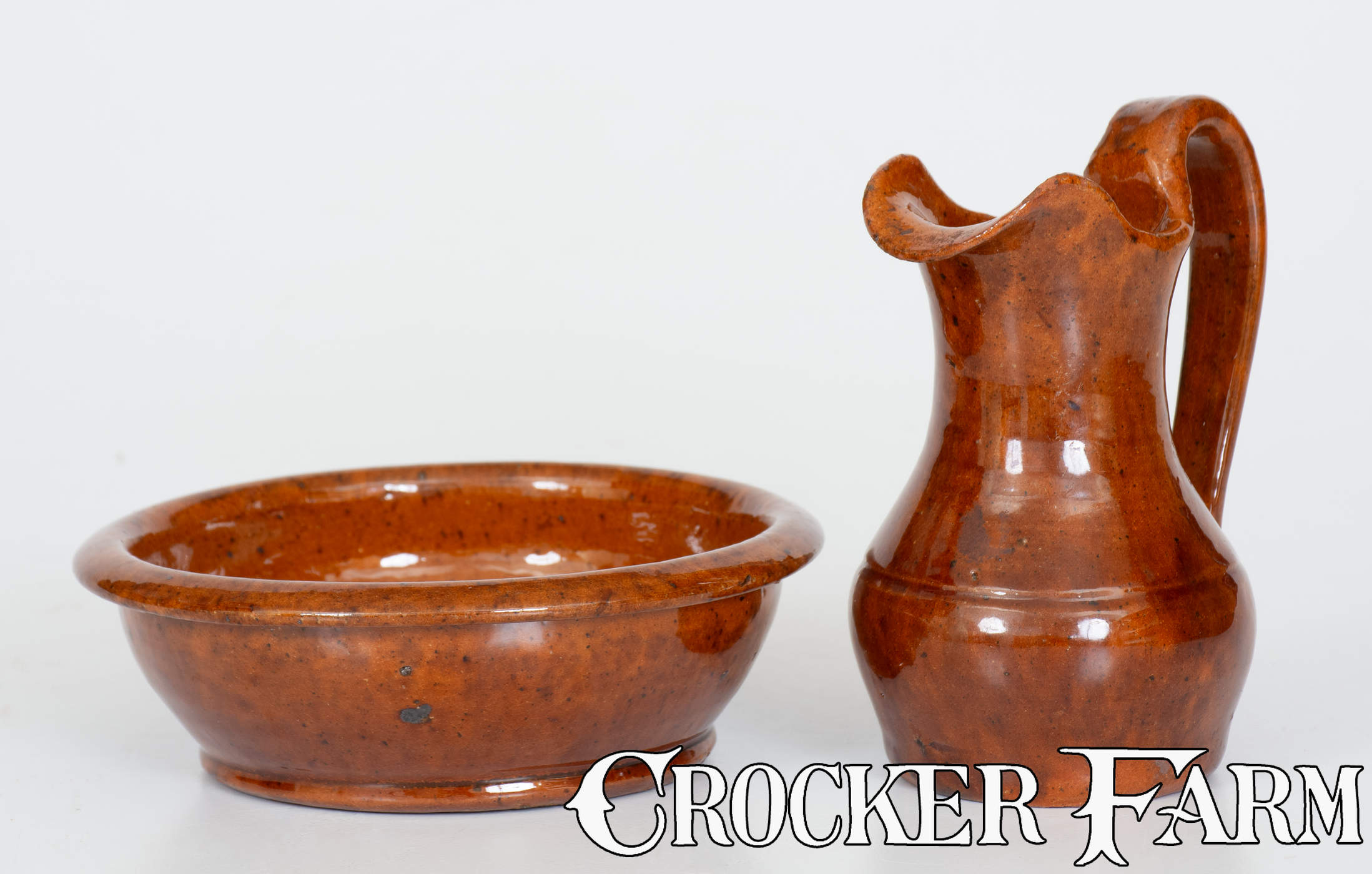 Rare Miniature Glazed Redware Pitcher and Bowl Set with Potter's Stamp, Stamped "JOHN BELL," Waynesboro, PA origin, circa 1840-1880, ovoid bowl with footed base and thin, semi-rounded rim, the exterior decorated with sponged manganese and entire surface covered in a clear lead glaze. Underside of bowl impressed with John Bell maker's mark between an incised X and a highly unusual stamp of a relief cross within a rectangle, likely indicating a piecemeal potter's work. Bowl includes its original wheel-thrown pitcher, ornately-potted with an ovoid waist, broad, upswept spout, and arched strap handle, featuring a matching glaze scheme. The pitcher does not bear a John Bell maker's mark, but includes the same cross stamp as seen on the bowl, indicating the two pieces were made as a set. A fine lot surviving in exemplary condition, intriguing in its inclusion of a mysterious potter's stamp. Bowl in excellent, essentially as-made condition. Pitcher in excellent condition with minor wear to spout. Both retain a brilliant, like-new luster. H (of pitcher) 4 1/2" ; Dimensions (of bowl): H 1 3/4" x Diam. 5".