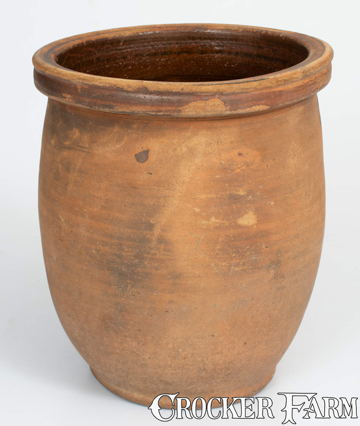 Very Rare and Important Redware Jar, Incised "A" and "X," attributed to Abraham Spencer at the John Coffman Pottery, New Market, VA, circa 1827-1860, ovoid jar with distinctive squared rim and rounded mouth, incised with a small inverted "A" on the front and three crosses of differing form and size around the midsection. The incised letter "A" on this jar indicates it was made by free African-American Shenandoah potter, Abraham Spencer (ca.1806-1873). According to Brenda Hornsby Heindl's Journal of Early Southern Decorative Arts article, "Freedom in a Slave Economy: Abraham Spencer and Pottery Making in the Shenandoah Valley," Spencer likely learned the trade while living in New Market, Shenandoah County, Virginia from one of his potter neighbors, either George Bodel or Jacob Adam. (See JESDA Vol. 41, 2020.) He was active in Rockingham, Frederick, and Shenandoah Counties of Virginia from the 1820s until the 1870s, most notably at the Bell Pottery in Strasburg, circa 1860-1873. Colorful stories about his involvement with the Bells are discussed in Rice and Stoudt's 1929 The Shenandoah Pottery, although some information is erroneous (see Heindl). An unglazed redware jar attributed to Spencer and bearing a "SOLOMON BELL / STRASBURG / Va.," maker's mark is illustrated in H.E. Comstock's The Pottery of the Shenandoah Valley Region, p. 476, fig. 7.86 as well as in Heindl, figs. 10-11. The jar in our Fall auction follows a form and rim construction consistent with pieces produced in New Market, Virginia for several decades of the 19th century and was attributed in 1995 by Shenandoah Valley pottery expert and author H.E. Comstock as probably made by Spencer at the New Market shop of John Coffman. A jar attributed to Spencer with large, inverted and incised "A" and exhibiting an almost-identical New Market form, likely made prior to his association with the Bells, is illustrated in Heindl, figs. 7 and 8. It is currently on display at The Museum of the Shenandoah Valley in Winchester, Virginia. Outside of the work of David Drake, the jar in this auction survives as one of a critical few 19th century American ceramic pieces with a form of signature attributing it to a specific African-American potter. Spencer's life can be viewed as one study of the lived experiences of black artisans in early America. While Edgefield, South Carolina's David Drake was forced as an enslaved man to produce pottery for most of his life, and Manhattan, New York's Thomas Commeraw saw freedom at an early age and ultimately established his own business, Abraham Spencer's story is one of a freeborn man developing and plying his trade in the antebellum South--a situation that may not have afforded him the success he deserved. Though learning the craft at an early age, Spencer was largely itinerant and there is no clear evidence that he ever owned his own shop. Physical evidence of his long career would be non-existent, but for a few jars inscribed with the first letter of his name. Provenance: Purchased in 1995 at the Florence Moomaw Estate Auction, Orkney Springs, VA. Excellent condition with a few rim chips, some wear to rim and interior, and two small in-the-firing pings to exterior surface. H 9".