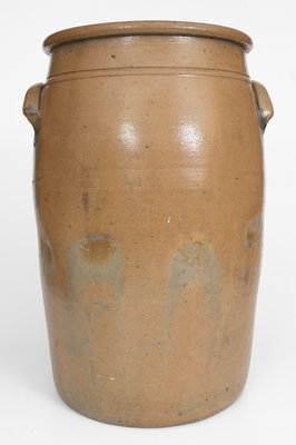 Ten-Gallon Cobalt-Decorated Stoneware Jar, Stenciled "R.T. WILLIAMS / NEW GENEVA, PA," circa 1880, cylindrical jar with tooled shoulder, applied lug handles, and semi-rounded rim, featuring R.T. Williams maker's stenciling surrounding a stenciled flourish with two small stenciled tulips above. Freehand stripe and stylized floral decoration to upper body. Base with freehand "10" flanked by dashes, underscored by a freehand stripe. Cobalt highlights to handle terminals. A 3 3/4" rim chip to front. Fry to cobalt. A 5" hairline from rim on front. A 3" x 2" in-the-firing line on underside, forming a 3" vertical crack at base on front, which includes a small hole and a small reglued piece leading to a large surface chip on interior. Three small chips to one handle. Opposite handle with a 1" chip and a 3/4" surface crack with minor nick. H 20 3/4".