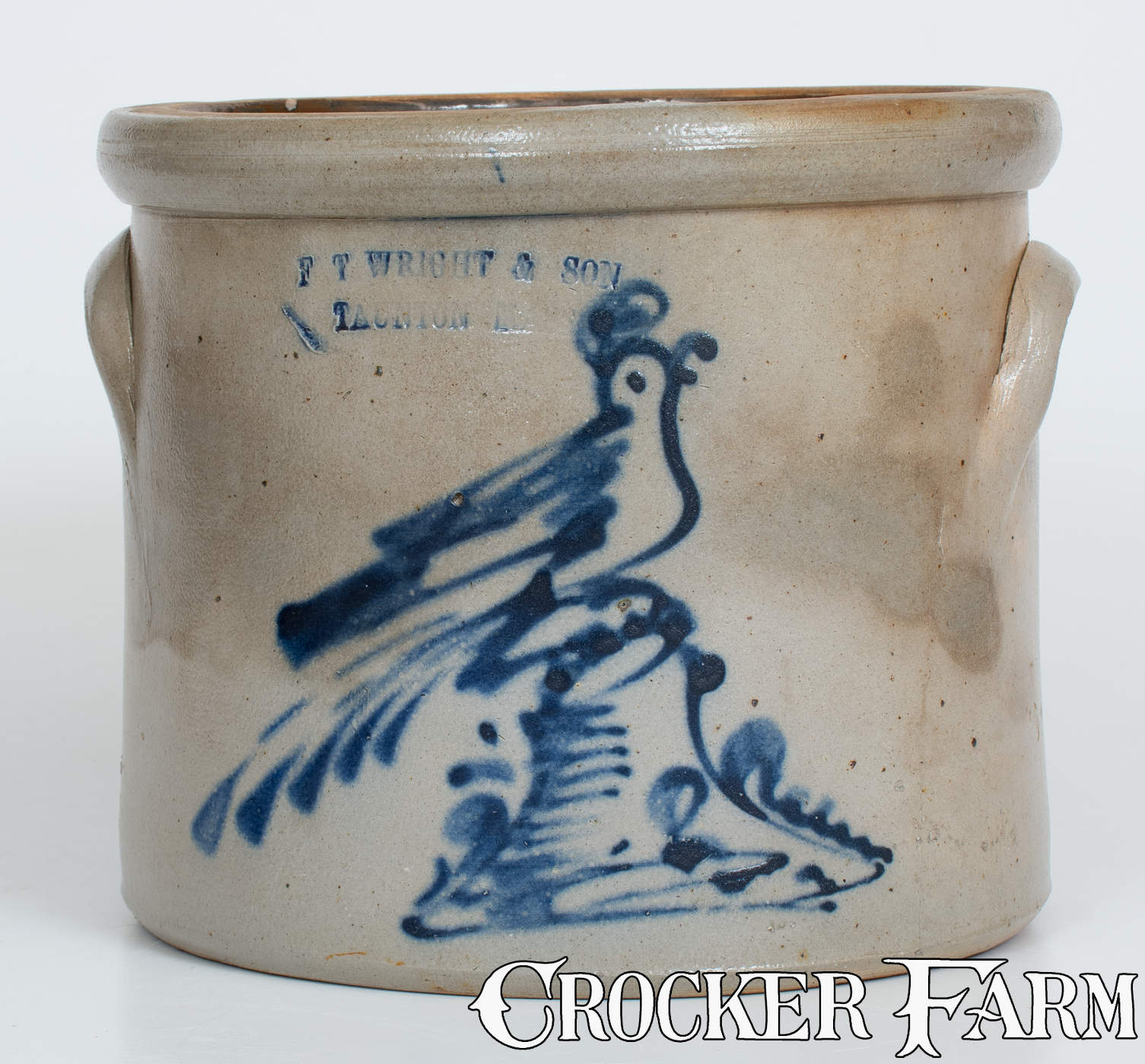 Scarce F. T. WRIGHT & SON / TAUNTON, MASS. Stoneware Crock w/ Bird-on-Stump Decoration