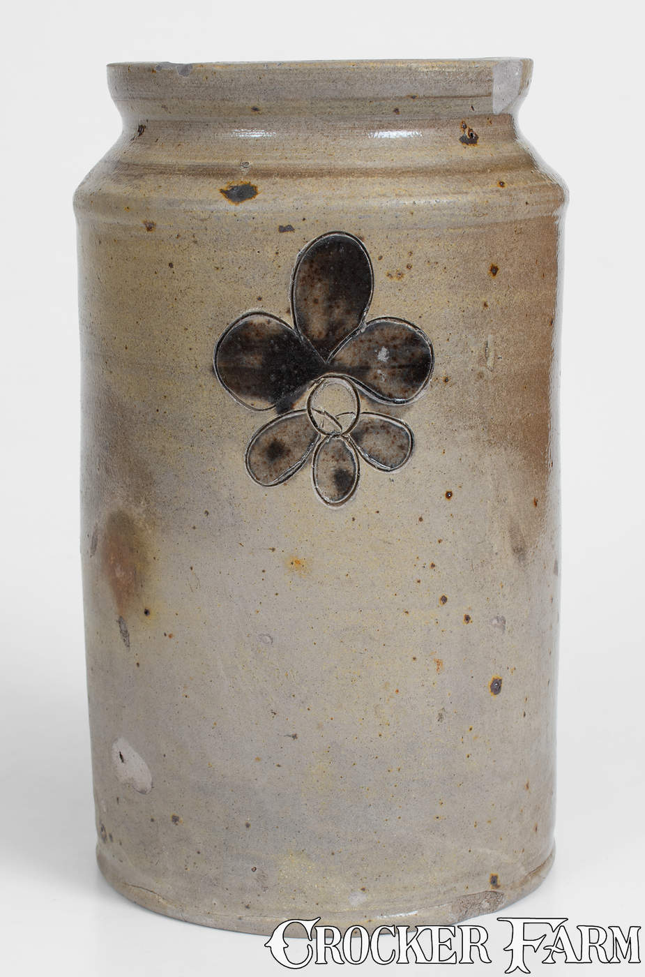 Rare and Fine Stoneware Jar with Two-Color Slip and Incised Floral Decoration, Stamped "J. REMMEY / MANHATTAN-WELLS, / NEW-YORK," early 19th century, small-sized, cylindrical jar with rounded shoulder and flared rim, the front featuring the cobalt-highlighted maker's mark of John Remmey III surrounded by an incised border formed with a two-pronged stylus. Reverse with incised flower blossom motif filled with blackish slip, likely composed of cobalt and manganese. Exceptional size, unusual form and strong decoration. Rim chips. Exfoliation to interior base, extending partway up interior wall of jar. A Y-shaped surface line to interior base, not visible on exterior. Base chips, one of which is glazed over. Large flakes to underside. A 2" curved surface line on underside, continuing a short distance onto base, not visible on interior. A 3/4" surface line on underside, continuing 2 1/4" up base, not visible on interior. A 7/8" flake near base on side of jar. H 9 1/2".