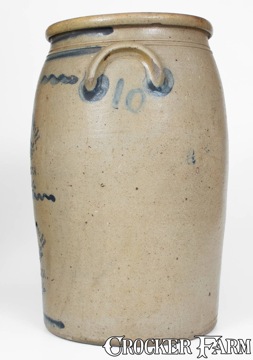 Rare Ten-Gallon Cobalt-Decorated Stoneware Jar, Stenciled Twice "WILLIAMS & COUCH / NEW GENEVA . / PA.," late 19th century, semi-ovoid jar with tooled shoulder, applied lug handles, and semi-rounded rim, featuring Williams & Couch maker's stenciling incorporating a stenciled vine motif. Freehand stripe decoration to shoulder, midsection, and base. Freehand "10" below one handle. Cobalt highlights to handle terminals. Unusual double stencil of a scarce maker's mark, potted in a desirable large size. One handle with a 1 1/4" flake and a few minor chips. Other handle with a 7/8" chip and minor nick. A small chip to interior of rim. A 6 1/2" vertical line to shoulder on reverse, not visible on interior. A 7 1/2" x 5 1/2" X-shaped crack on underside, including a 4" vertical crack at base on front and 5" diagonal hairline at base on front. A 4 3/4" faint diagonal surface line to right of lower "COUCH" stencil. Some surface wear and flecks of white paint to surface. A 7" vertical line to shoulder on reverse, not visible on interior. Two chips to bottom edge of rim. Minor surface staining. H 20 1/4".