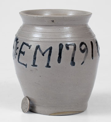 Extremely Rare and Fine Small-Sized Stoneware Presentation Jar with Elaborate Cobalt Vine Decoration, Inscribed "EM 1791," Abraham Mead, Greenwich, CT, 1791, thinly-potted, ovoid jar with heavily-tooled shoulder and flared rim, brush-decorated around the shoulder with an elaborate scrolled vine flanking the initials and date, "EM 1791." Among a small number of dated eighteenth century American stoneware pieces known, this work features an appealing size, remarkably thin potting for its medium, and fine brushwork related to the well-known "watch spring" motifs of the period. Mead's decorative vocabulary was likely based in the work of the Greenwich master potter he trained under, Adam States, Sr. A few known Manhattan products made by States prior to the establishment of his Greenwich pottery reveal more simplified scrolled designs in a similar black-blue slip. A related Mead jar, inscribed "HL / 1791," resides in the collection of the Brooklyn Museum in Brooklyn, NY. Provenance: Descended in the Mead family; The Personal Collection of Lewis Scranton, Skinner Auctions, May 21, 2016, lot 106; Warren F. Hartmann Collection. Excellent, essentially as-made condition, noteworthy for the age of the object. H 6".