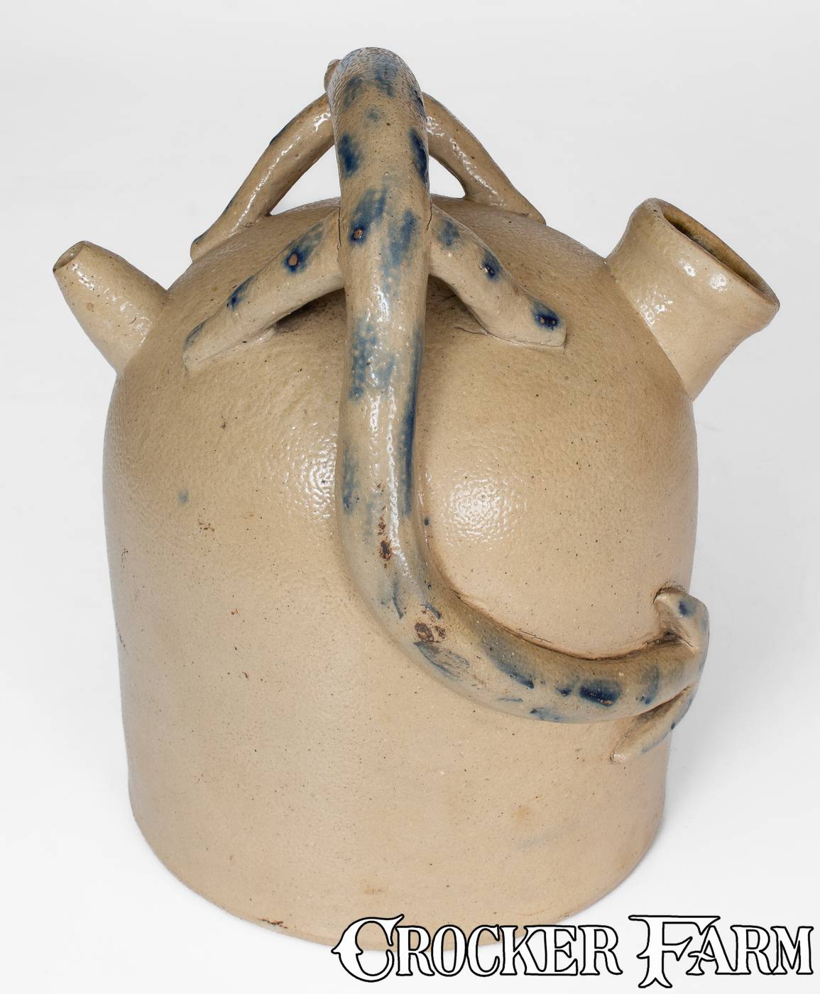 Extremely Rare Cobalt-Decorated Stoneware Harvest Jug with Lizard-Form Handle, OH origin, circa 1885, beehive form, the shoulder fitted with a wheel-thrown and applied wide spout for filling and a narrow spout for pouring, the handle modeled in the form of a standing lizard with long forked tail and applied stones forming the animal's eyes. Surface of handle profusely-decorated with cobalt brushwork and entire surface covered in a clear salt glaze. Albany-slip-glazed interior. A cork with staple serves as the stopper for the large spout. This outstanding combined folk sculpture/pouring vessel carries an exceptionally early publication history, having been illustrated and discussed in a 1946 Magazine Antiques article by noted Ohio antiques authority, collector, and dealer, Rhea Mansfield Knittle. Knittle notes that the jug was originally found on the Western Reserve of Ohio and describes the figural handle as probably "meant to represent demon rum." Literature: Knittle, "Early Decorative Arts in Ohio," The Magazine Antiques, January 1946, Vol. XLIX, No. 1. ; The Stradlings, Art of the Potter, p. 142. Lizard missing lower jaw, as seen in the above article. Otherwise excellent condition. H 10 1/2".