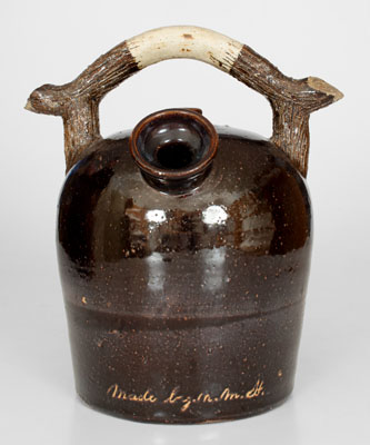 Very Rare Stoneware Presentation Harvest Jug, Inscribed "Milton Slick / Suffield / Ohio," and "Made by N.M.H.," OH origin, circa 1890, beehive form with button-shaped finial and heavily-incised handle in the form of a sawed tree limb, the front and reverse with narrow spout for pouring and wide spout for filling; surface covered in a dark-brown Albany slip glaze with unusual omission of the glaze along the midsection of the handle, this area instead coated in a salt glaze over a grayish-white ground. Incised into the Albany slip on the front with the presentation inscription, "Milton Slick / Suffield / Ohio," and on the reverse with the signature at base, "Made by N.M.H." Originally from Ephrata, Pennsylvania, Slick (1865-1939) arrived in Suffield sometime between 1880 and 1889, when he married there. He appears in the 1900 federal census as a farmer, the same vocation as the George Swinehart of the previous lot, speaking to these vessels' use as harvest jugs. Slick's actual name was Milroy G. Slick, but even the 1920 census taker misspelled his name as "Milton," and based on thorough research, this was the same individual. As noted in the previous lot, it is likely that "N.M.H." was Noble Hope (born circa 1853), who appears as a 16-year-old potter working in Springfield, Summit County, Ohio, in the 1870 census. Little is known about Hope, and his later life is not properly documented. A fine example of a classic Ohio form that includes both the potter's signature and the person for whom it was made. Provenance: Robert and Nancy Treichler Collection, Tallmadge, OH. Full restoration to smaller spout. A few chips to ends of handle. H 12".