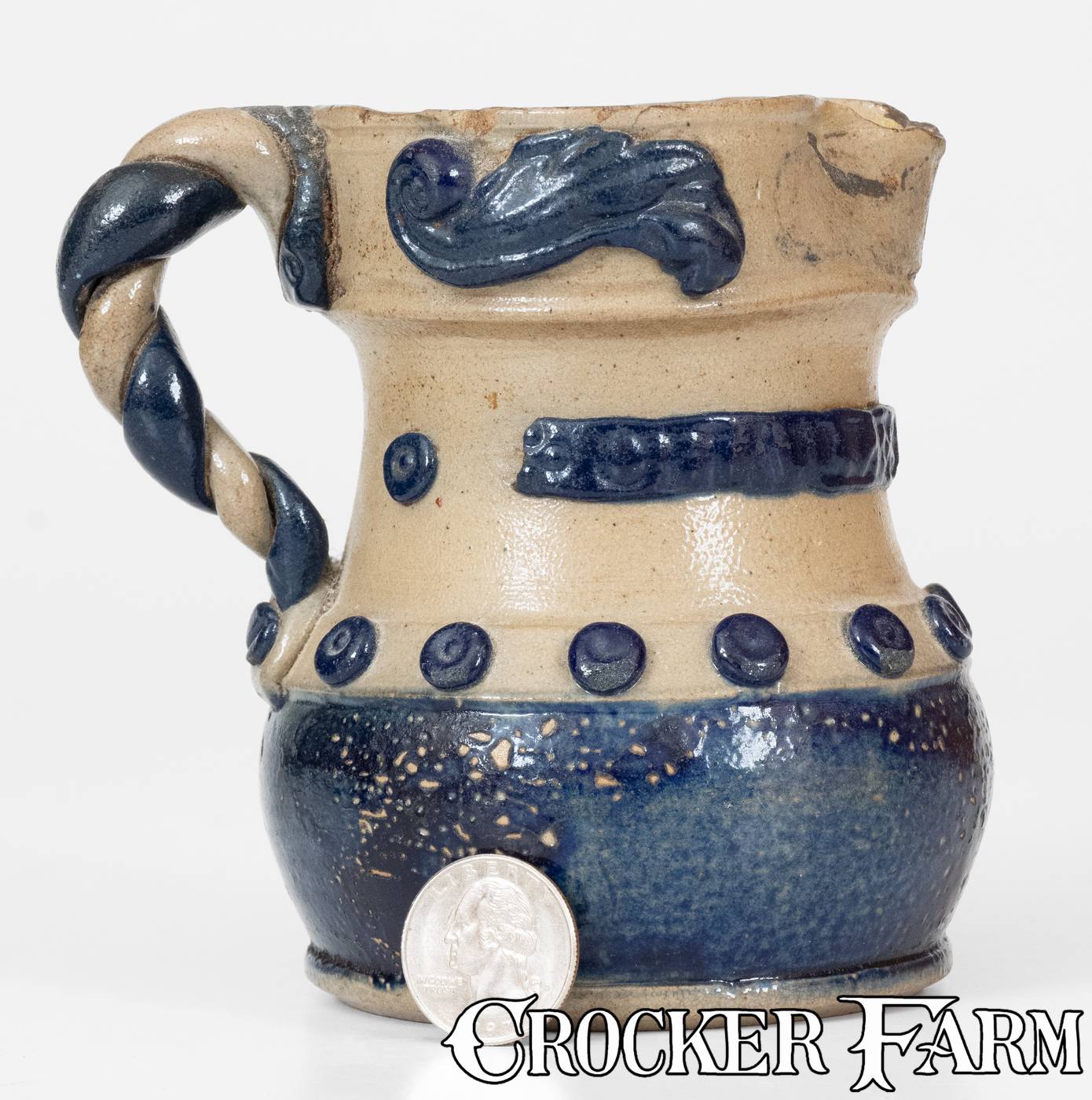 Rare Miniature Stoneware Presentation Pitcher with Applied Decoration, Stamped "CHARLES COLLIER," Northeastern U.S. origin, third quarter 19th century, ovoid pitcher with footed base and tall collar with prominent rim molding, decorated around the midsection with applied buttons and at the collar with a banner, impressed "CHARLES COLLIER," flanking two additional buttons. Handle formed from two twisted pieces of clay with impressed screwheads to upper terminal and applied clay screwhead to lower terminal. Rim with molded and applied scroll motif. Belly of pitcher highlighted completely in cobalt, along with cobalt highlights to applied decoration and handle. An imaginatively-decorated work of exceptional size. Applied scroll motif was lost during the firing to the spout area and proper left side of the rim. Heavy chipping to spout, small rim chips, and a worn section to rim. A chip to applied banner with name and wear to ends of banner. A chip to bottom edge of rim molding. H 4 7/8".