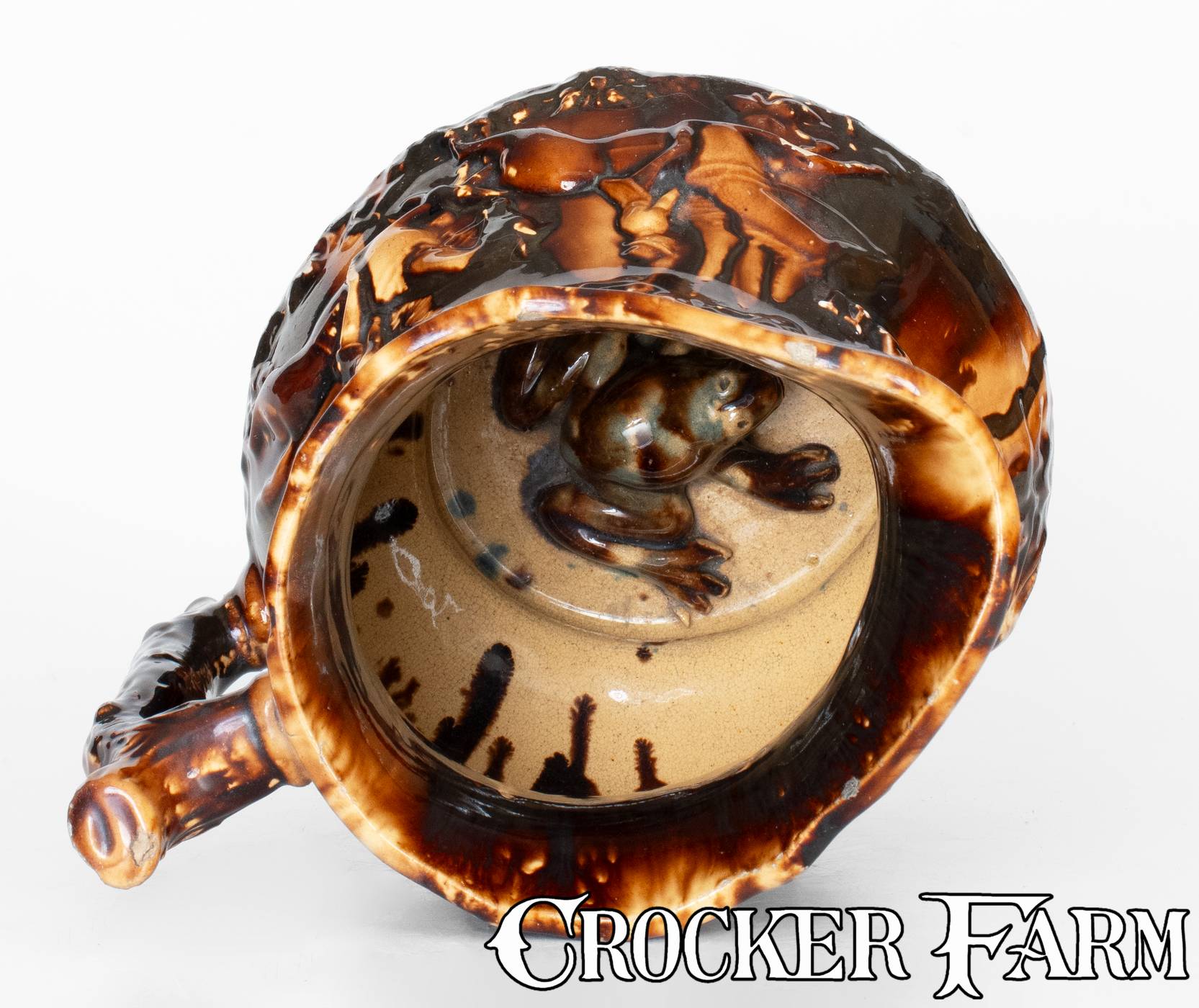 Extremely Rare Rockingham Ware Frog Pitcher, Embossed "D REGAN," Incised "Daniel Regan / August 3 / 1870," Daniel Regan at the John L. Rue and Company Pottery, South Amboy, NJ, 1870, molded pitcher with twig-form handle and relief decoration of hunters on horseback and hounds chasing a stag, the collar with relief grape vine motif. Front shoulder features the name, "D REGAN," in applied white block letters. Underside incised "Daniel Regan / August 3 / 1870." Born circa 1854 in Ireland, Daniel Regan immigrated to America in 1866 and is listed in the 1870 federal census as a 16-year-old laborer living in South Amboy; in the 1880 census he is specifically called a potter, so he was probably apprenticed to the potter's trade when this pitcher was made. Interior base with molded and applied figure of a frog covered in a blue-and-brown flint enamel glaze. Surface covered in a mottled reddish-brown to dark-brown glaze over a yellowish ground. This pitcher is one of a small number of New Jersey Rockingham pitchers known with a hand-incised potter's signature. The intriguing placement of the potter's name on both the shoulder and underside indicate this work was either made by Regan for his own personal use or as a gift for his father, who shared his name. Arguably the best example of New Jersey Rockingham ware that we have ever offered. Illustrated in Goldberg, "Highlights in the Development of the Rockingham and Yellow Ware Industry in the United States: A Brief Review with Representative Examples," Ceramics in America 2003, fig. 26. Three small rim chips and minor rim wear. Shallow chips to top of handle. A few small base chips and an in-the-firing contact mark to underside. Some flakes to high points of relief decoration. H 8 3/4".