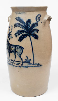 Extremely Rare Six-Gallon Stoneware Churn with Elaborate Cobalt Deer Scene, Stamped "JOHN BURGER / ROCHESTER," NY State origin, circa 1860, ovoid churn with flared rim and applied lug handles, decorated with an artistic slip-trailed design of a deer with turned head and heavily-spotted body, standing on a detailed mound beside of a large, palm-like tree with pine tree in the distance. Slip-trailed "6." to shoulder. Cobalt highlight to maker's mark. Iconic maker and decoration. Includes Albany-slip-glazed lid. Exhibiting bold, crisp slip-trailing and superb color, this work combines New York State's premier potter/decorator with one of the region's most prized designs. It is the first John Burger, Sr. deer churn that we have ever offered. A number of deer-decorated churns were produced two decades later when the pottery was operated by Burger's son, John Burger, Jr. Evidently, this design was used sparingly on this form during the father's tenure. An outstanding example from the venerable Rochester school of stoneware production, the standard for American stoneware decoration, this churn was previously owned by John Morgan, one of the formative figures in New York State stoneware collecting. Provenance: Ex-John Morgan, Pike, NY. Significant restoration around the first few inches of the base, underside, and interior base, not affecting decoration. Some touch-up to jaw area of deer and larger tree. A 5/8" handle chip with a 1" horizontal surface crack extending from it. A 2 5/8" Y-shaped hairline to reverse. Chips to inner rim for lid. H 20".