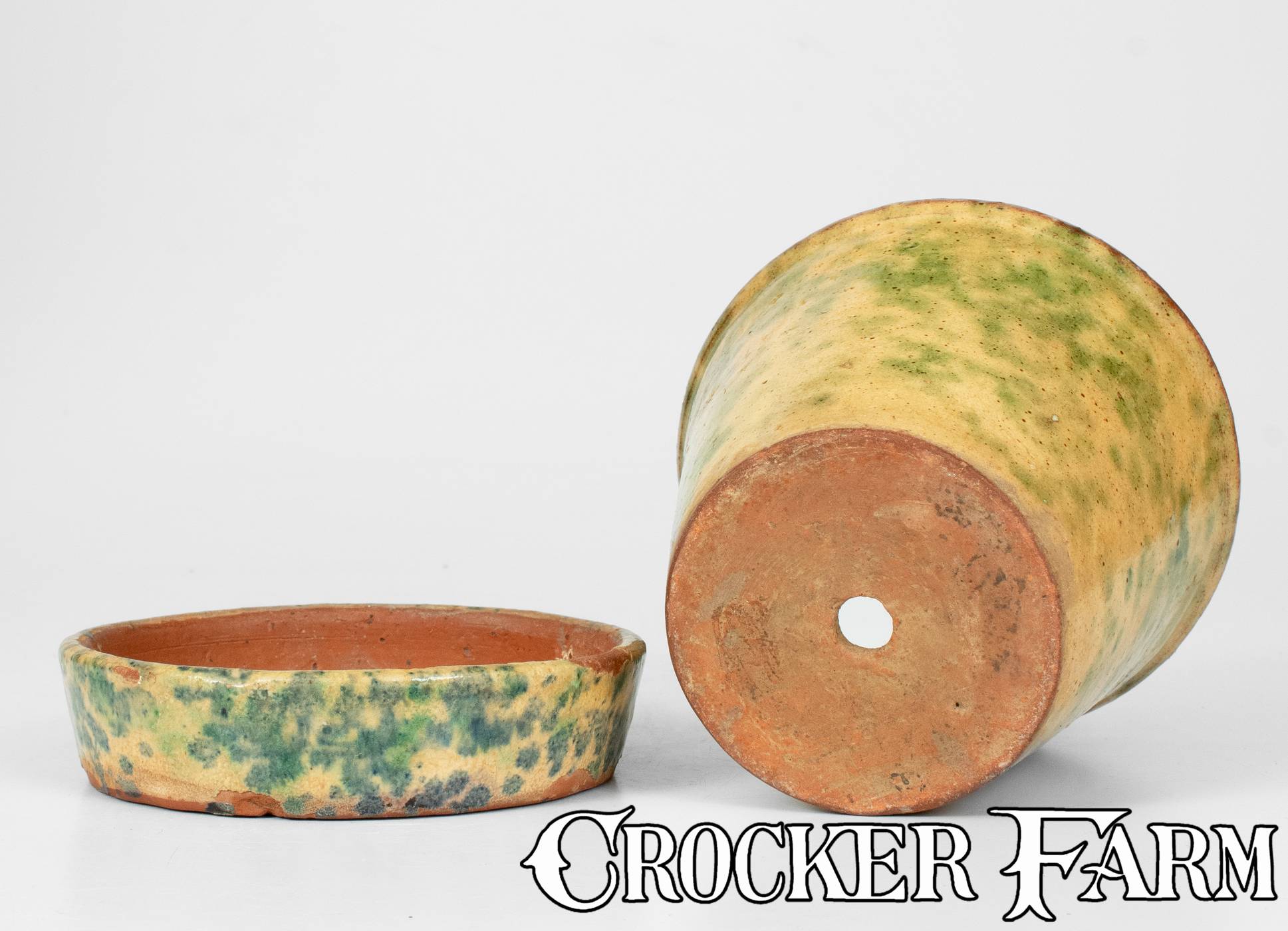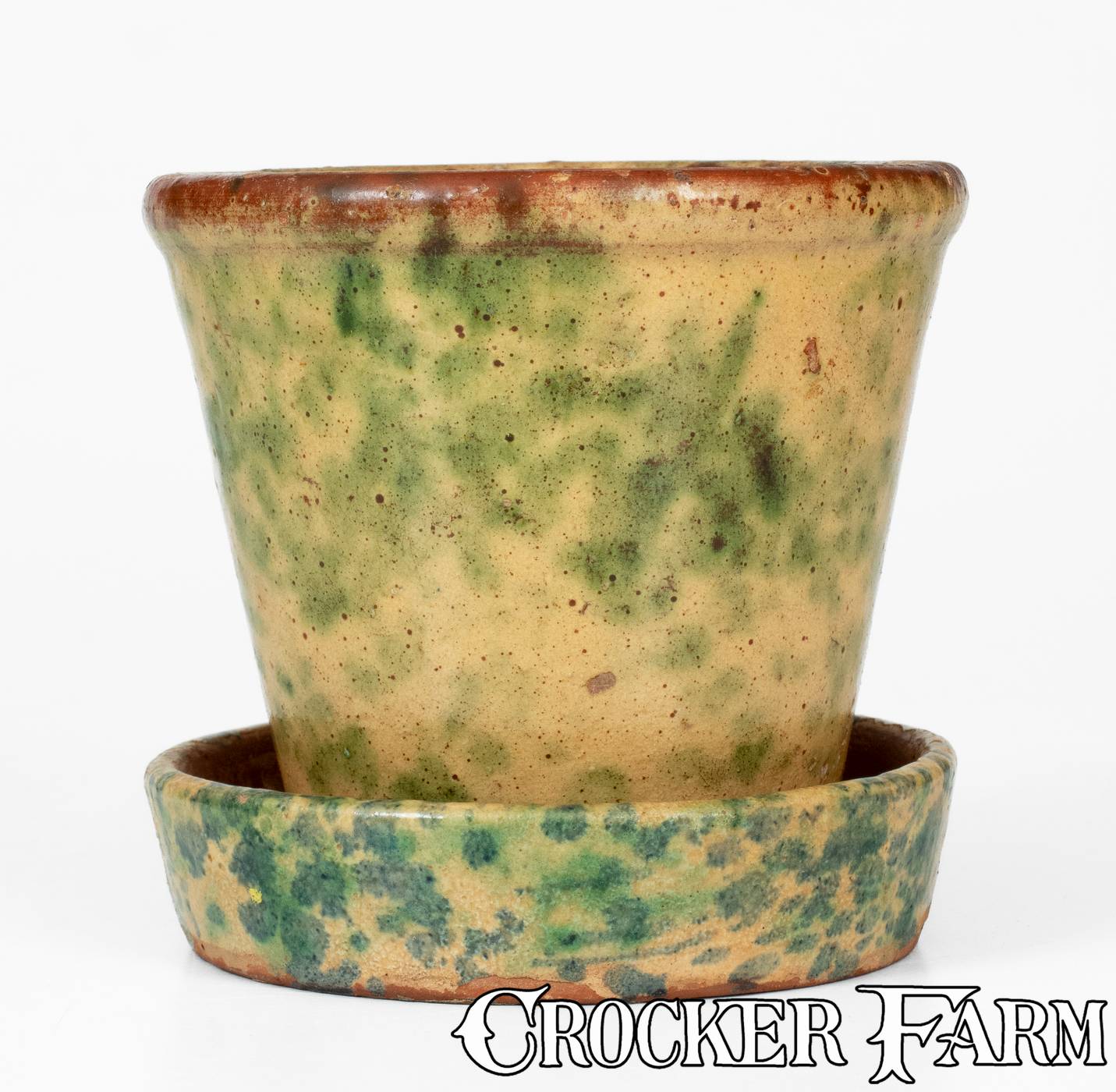 Unusual Redware Flowerpot and Saucer with Sponged Copper and Cobalt Decoration