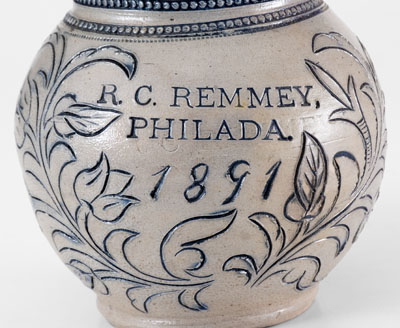 Extremely Rare and Important Small-Sized Stoneware Pitcher with Elaborate Incised Floral Decoration, Stamped "R. C. REMMEY, / PHILADA.," Dated "1891," Richard Clinton Remmey, Philadelphia, PA, 1891, highly-ovoid pitcher with footed base and tall collar with unusual rebated rim, the body decorated with two incised tulip plants flanking the impressed inscription, "R. C. REMMEY, / PHILADA." Incised below with the date, "1891." Coggled circle treatment to collar. Cobalt slip accents the impressed stamp and the incised and coggled elements of the design. This recently-surfaced pitcher is the only example of stoneware that we have seen bearing this specific stamp for Richard Clinton Remmey, the most recognized figure in Philadelphia stoneware production. Made roughly 160 years after the Remmeys' arrival in Manhattan, New York, it showcases a penchant for incised decoration progressively seen in this family work's as members traveled from Manhattan to Baltimore and finally to Philadelphia. The placement of the stamp as seen on other Remmey presentation pitchers of the period strongly suggests this work was made by Richard Remmey for his own personal use. This potter's significance to Philadelphia's ceramic industry and the legacy of American stoneware as a whole is well-documented in his numerous tulip-decorated vessels surviving today, many bearing his well-known "R.C.R / PHILA" stamp. The vessel's stylish potting, petite size, and abundant decorative treatments add high decorative value to this noteworthy vessel. Purchased: A fresh-to-the-market example, purchased by the consignor decades ago. Excellent, essentially as-made condition. H 7 3/4".