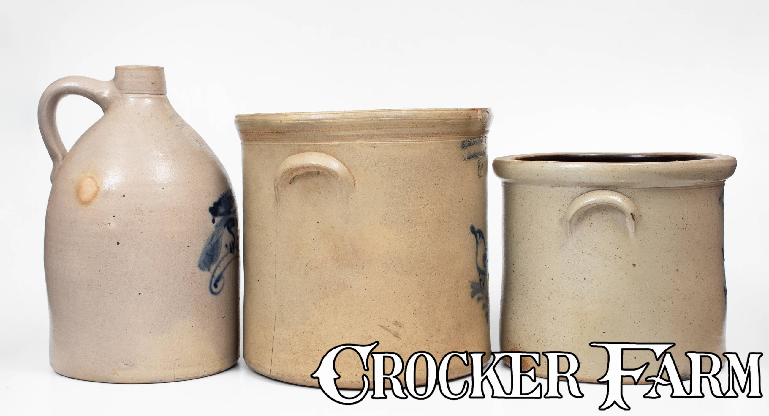 Three Pieces of Stoneware with Cobalt Bird Decorations, Northeastern Origin, circa 1880-1890, a two-gallon jug stamped "WEST TROY, / N.Y. / POTTERY.," decorated with a slip-trailed design of a crested bird perched on a stylized branch; together with a three-gallon crock stamped "SEYMOUR & BOSWORTH / HARTFORD" and a five-gallon crock stamped "S.B. BOSWORTH / HARTFORD," both with brushed and slip-trailed design of a bird perched on the stem of a plant. West Troy jug with some rim chips, thins lines at spout and base, and 8" x-shaped crack emanating from colored kiln burst on right. Seymour & Bosworth crock with large areas of restoration throughout, not affecting cobalt decoration, and large chip and cracks on underside, part of one extending 3" up front right. S. B. Bosworth crock with rim chips, rough 1" contact mark on front rim, several thin lines, and 8 1/2" crack on left. Both Hartford crocks with some fry to cobalt. Jug with fry to cobalt, restoration to surface, not affecting decoration, some exfoliation to underside, and a tiny nick to spout. Crock with light fry to cobalt, rim chips, staining and surface lines at base on reverse, and a Y-shaped line at base on reverse, continuing a short distance onto underside. H (of jug) 14 3/4".