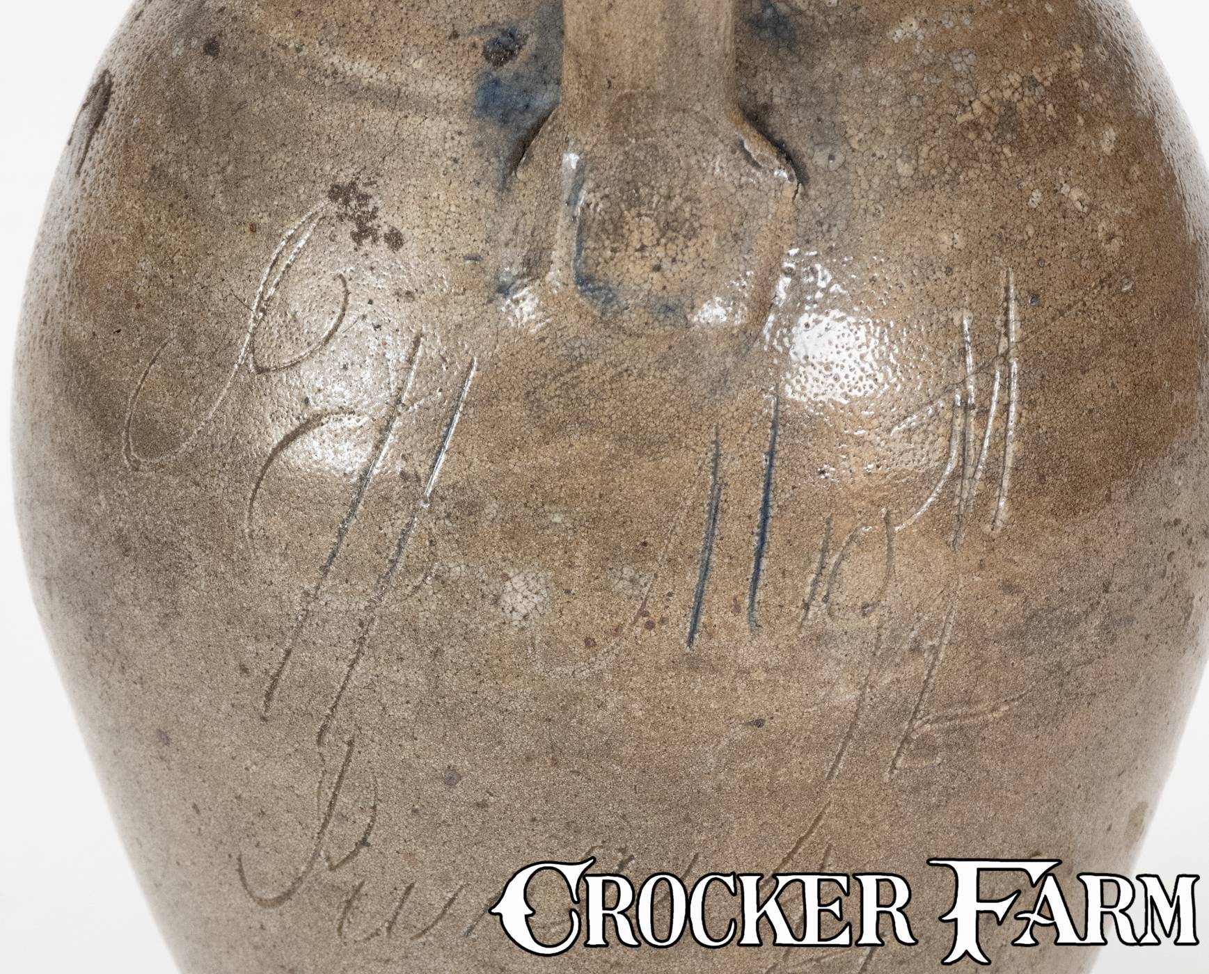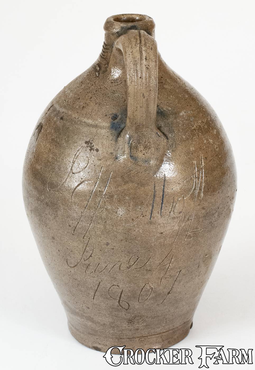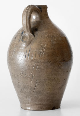 Very Rare Small-Sized Stoneware Presentation Jug, Inscribed "JH Mott / June 4 / 1807," John Remmey III, Manhattan, NY, 1807, ovoid jug with footed base and heavily-tooled spout, the reverse featuring the incised signature and date, "JH Mott / June 4 / 1807." Front impressed with John Remmey III maker's mark, "J. REMMEY / MANHATTAN-WELLS. / NEW-YORK." Cobalt accents to maker's mark and handle terminals. The Mott family of Manhattan was an extremely prominent one whose memory best lives on in the presence of Mott Street in modern-day Chinatown. Perhaps the most legendary member of its family is Anne Coles Mott, who during the American Revolution administered aid to American POW's held in abject conditions in makeshift British prisons around Manhattan. Anne Coles Mott and her husband, Isaac Mott, a Quaker merchant, had three sons, Samuel, Jordan, Jacob, and a daughter, Jerusha. There seems to be some dispute over the exact namesake of Mott Street, but the most credible explanation we have seen is that it was named after this Jacob Mott, a deputy mayor and alderman of the city, who bought a sizable land holding there. Jordan Mott, a Pearl Street watchmaker, married a member of the prominent local Hopper family and a result of their marriage was John Hopper Mott, born in 1803. Through a long study of this family's genealogy, this seems to be the only reasonable candidate for the recipient of this jug, which may explain its unusually small size. A long, sealed inverted Y-shaped crack ascending from base on proper left side, extending onto shoulder area on reverse. Three minor base chips. A salt drip on front. H 9 1/2".