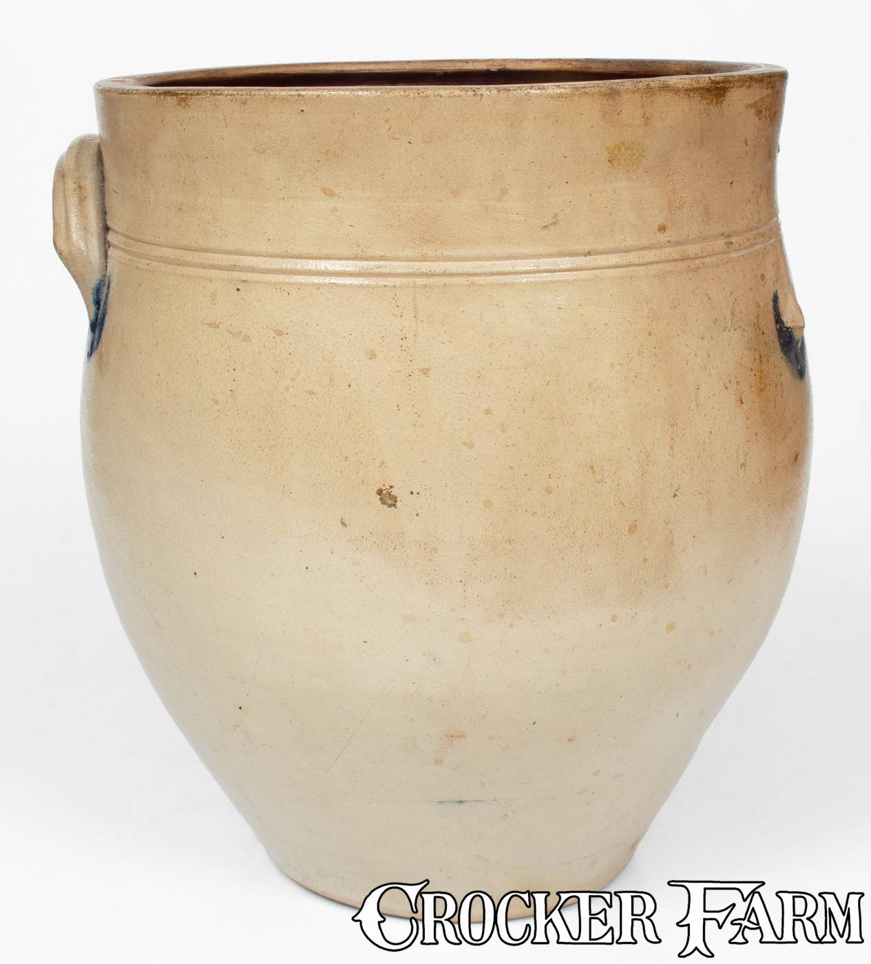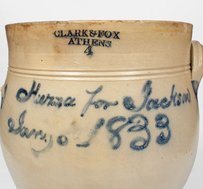 Very Rare Four-Gallon Cobalt-Decorated Stoneware Political Jar, Inscribed "Hurra for Jackson / Jany. 1833," Stamped "CLARK & FOX / ATHENS," NY State origin, 1833, highly-ovoid jar with tooled shoulder, flared collar, and ribbed lug handle, decorated with the brushed cobalt inscription, "Hurra for Jackson / Jany. 1833." This work, made at the pottery of partners, Nathan Clark, Sr. and Ethan S. Fox, celebrates Andrew Jackson's victory against Henry Clay in the Presidential Election of 1832. Jackson would be inaugurated weeks after this jar was made, on March 4, 1833. The "Hurra for Jackson" was both a slogan and a literal cry yelled by strident Jackson supporters of the time. Cobalt highlights to maker's mark. This work combines an appealing political slogan with attractive potting and desirable maker. Relatively few examples of American presidential stoneware are known. Provenance: A fresh-to-the-market example, purchased decades ago by the consignor. Missing one handle. Rim chips. A 7 1/2" inverted Y-shaped line to front, including an in-the-firing iron ping to the right of it. Some fry to cobalt. A long diagonal spider crack extending from base on reverse to area below one handle. Some minor staining. Base with a shallow 1 1/2" flake and a small in-the-firing flake. H 13 1/2".