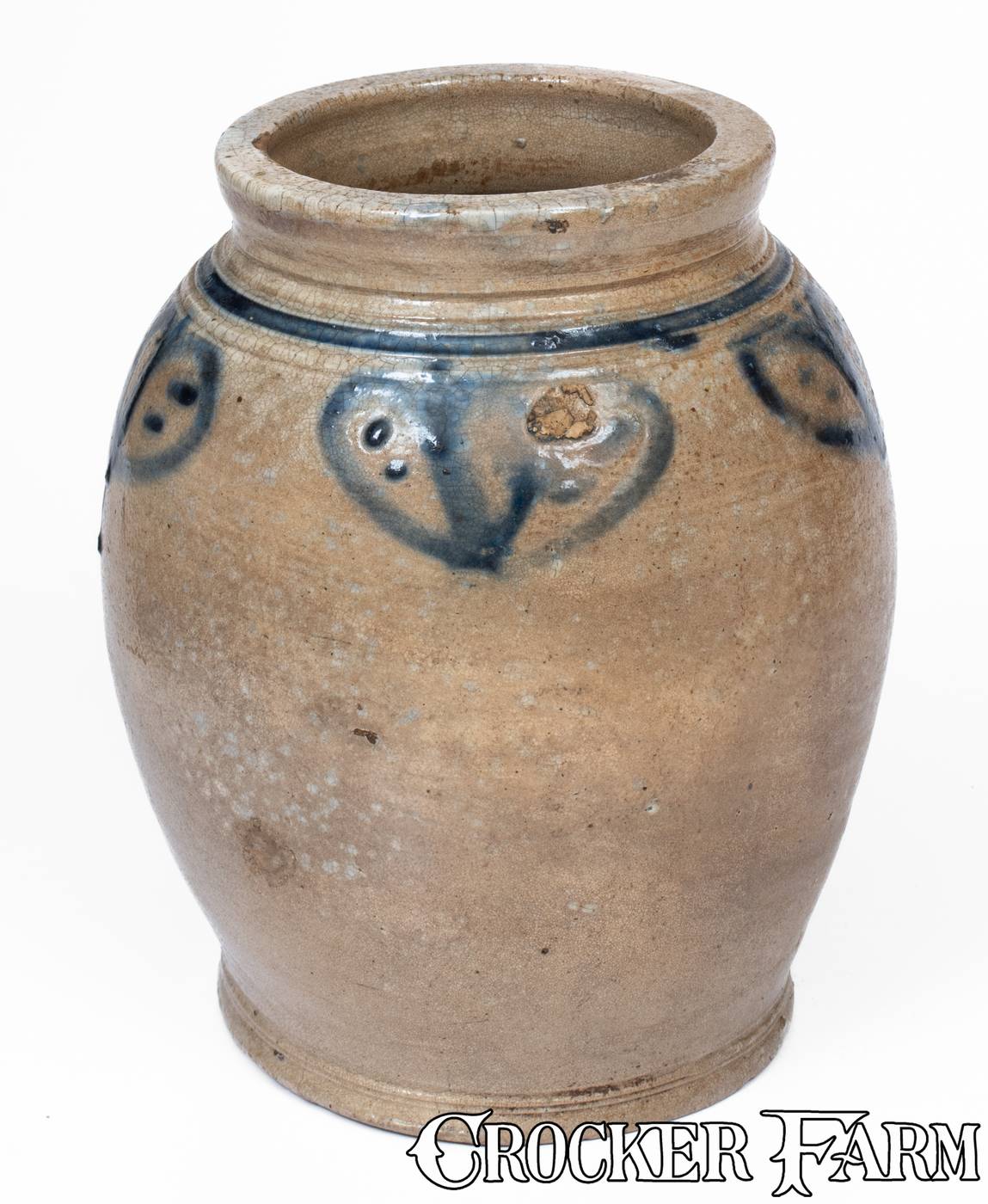 Very Rare Small-Sized Manhattan Stoneware Jar w/ Slip-Trailed Floral Decoration, mid 18th century