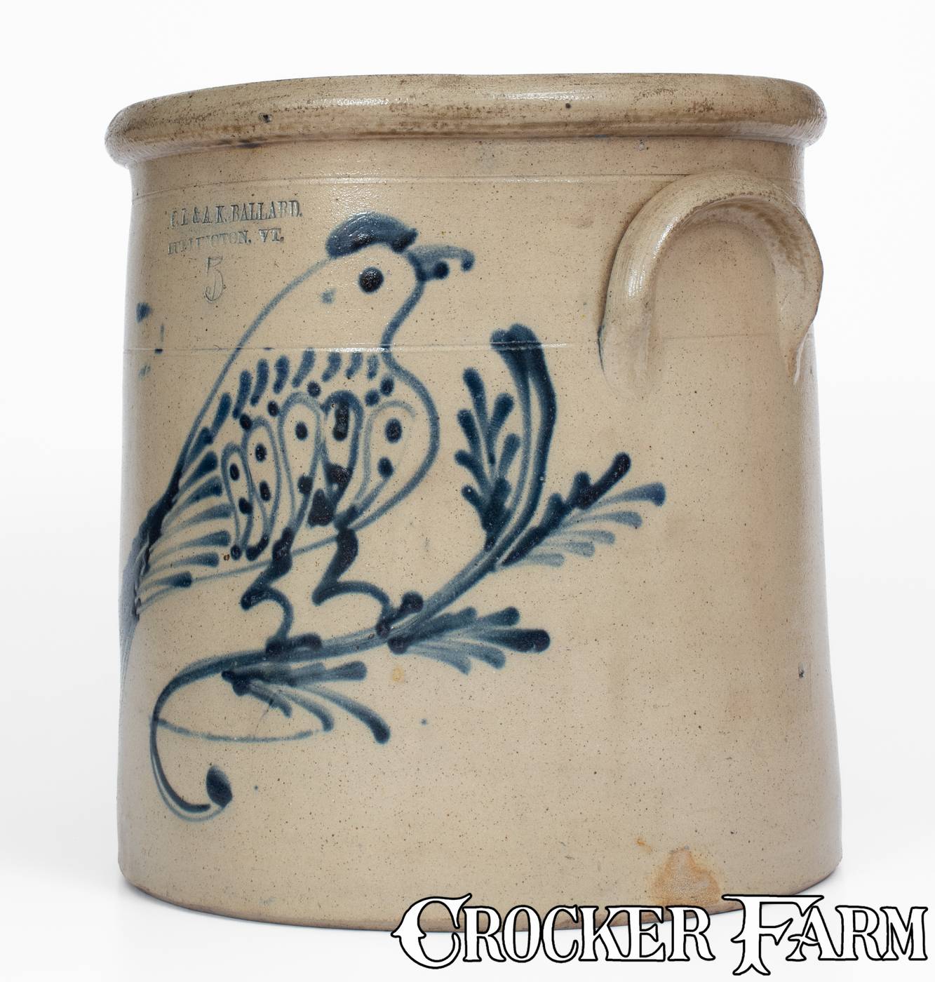 Five-Gallon O.L. & A.K. BALLARD / BURLINGTON, VT Crock w/ Elaborate Cobalt Bird Decoration