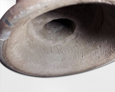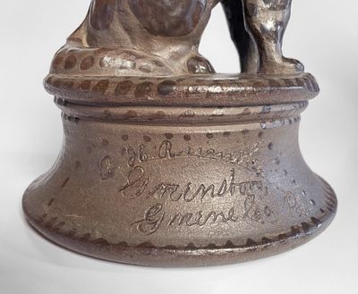 The Rumble Prohibition Spaniel: Important and Unique Salt-Glazed Stoneware Spaniel on Base with Profuse Albany Slip Decoration, Inscribed "R.H. Rumble / Greensboro / Greene Co., Pa. / anti-Amendment / 185 000," Signed "B.M.R. MR [Maker]," "B.M. Rumble," and "Ben M.R." with Additional Signatures, Dated June 18, 1889, Greensboro, PA origin, 1889, molded figure of a spaniel with incised details to face and paws, seated on a wheel-thrown pedestal base with tooled rim. Elaborate Albany slip spot decoration to dog, highlights to facial features, ears, and paws, and delicate spotting to forehead. A spot-decorated collar appears at the animal's neck. Base incised "R.H. Rumble / Greensboro, / Grene(sic) Co., Pa.," within an arched border of Albany slip spots. Albany slip swag decoration around circumference of base and along top edge, underscored by two rows of Albany slip spots. Surface of spaniel and base covered in a clear salt glaze. Made by Greensboro potter, Benjamin R. Rumble, for his brother, Robert H. Rumble, this extravagantly-decorated presentation piece commemorates a vote against an amendment that would have brought the prohibition of alcohol to the state of Pennsylvania. Several hand-incised signatures of different Greensboro potters are scrawled on the underside, indicating the Rumble brothers and other pottery workers met at a local pottery to commemorate their votes through the signing of this spaniel along with the inscriptions, "anti-Amendment "and "185 000," the latter noting the rough number of votes that rejected the amendment. The day of the vote, "June 18th 1889," is included as well. The names on the underside are as follows: B. M. Rumble, R. H. Rumble, Dan Rumble, F. Clevenger, Isam Wilson, Wm. Herrington, J. Couch, and F. Neil. We have been able to identify each of these men in the historical record, all except two being clearly documented there as Greensboro pottery workers. Particularly poignant is the strong sense of camaraderie in the stoneware shop communicated by this object, perhaps greater than any other known example of American stoneware. This iconic object combines rarity, high decorative appeal, and regional history with a strong sense of sentimentality to produce one of the most important Western Pennsylvania stoneware pieces to come to auction in years. Provenance: Garth's Auction, 1982. Excellent, essentially as-made condition with an in-the-making chipped and dented section to tail. H 9 3/4".
