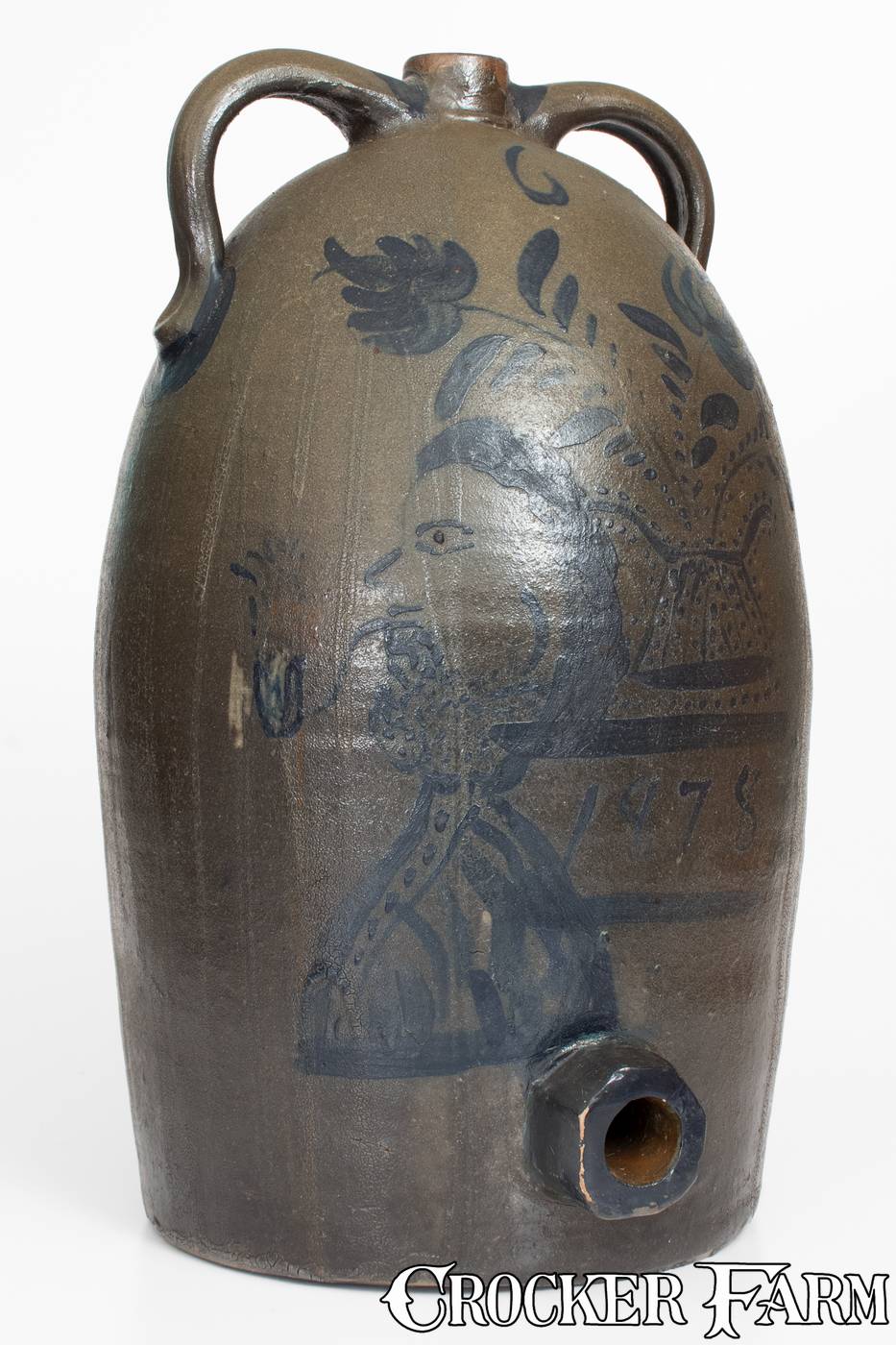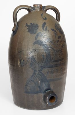 Outstanding Six-Gallon Stoneware Water Cooler with Cobalt Man Smoking Pipe and Flowering Urn Decorations, Dated 1878, Western PA origin, 1878, cylindrical, jug-form cooler with faceted bunghole, narrow spout, and two applied handles at the shoulder, Body of cooler dipped in a slip coating and brush-decorated with a large bust of a bearded man with buttoned shirt, smoking a pipe, beside a stylized urn bearing three flowers in the Western PA style, above the date, "1878." Elaborate spot decoration within and bordering the urn. Brushed "6" above. Cobalt highlights to bunghole and handle terminals. This wonderfully-decorated cooler is one of a small number of Western Pennsylvania stoneware pieces decorated with a detailed bust of a person. While this cooler's unusual, six-gallon jug-cooler form suggests it is a specially-made object, its extravagant and highly unusual decoration confirms this idea. The imposing, 9 3/4" tall rendering of a man, possibly the cooler's owner or a self-portrait of a potter, elevates this piece to a significant work of American ceramic folk art. Provenance: From a recently-surfaced Illinois collection. Approximately half of bunghole restored. Otherwise excellent condition. H 20".