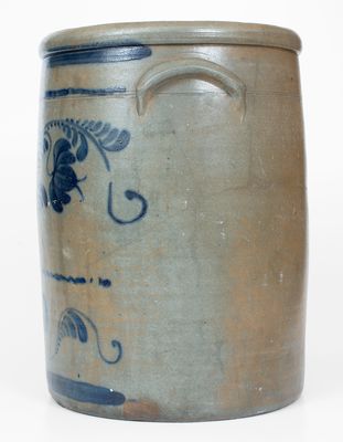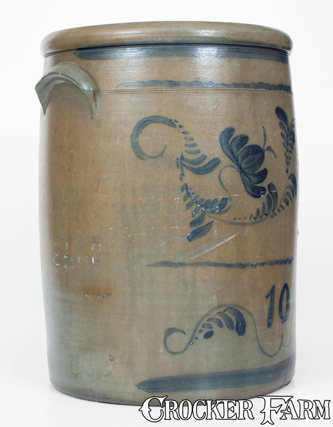 Ten-Gallon Stoneware Jar with Elaborate Freehand Cobalt Decoration, Western PA origin, circa 1870, cylindrical jar with tooled shoulder, applied lug handles, and semi-rounded rim, brush-decorated with an undulating fuchsia vine motif between freehand stripes. Base inscribed "10," above a looping vine motif. Freehand stripe at base. Provenance: From a recently-surfaced Illinois collection. A minor nick to one handle. A Y-shaped crack across underside, including a 3 1/4" reglued piece. This damage includes a 3" filled flake on underside, which tapers to a 1 1/2" filled hole in underside. The crack on the underside forming a long curving crack on reverse, which extends across the midsection of the proper left side of the crock and onto the front, and includes two vertical cracks ascending from it. The crack on the underside additionally includes a crack that extends 5" up the base of the crock's front. Minor areas of whitish residue to surface. A glazed-over scratch and raised bubble to midsection on front. Some minor surface staining. H 17 3/4".