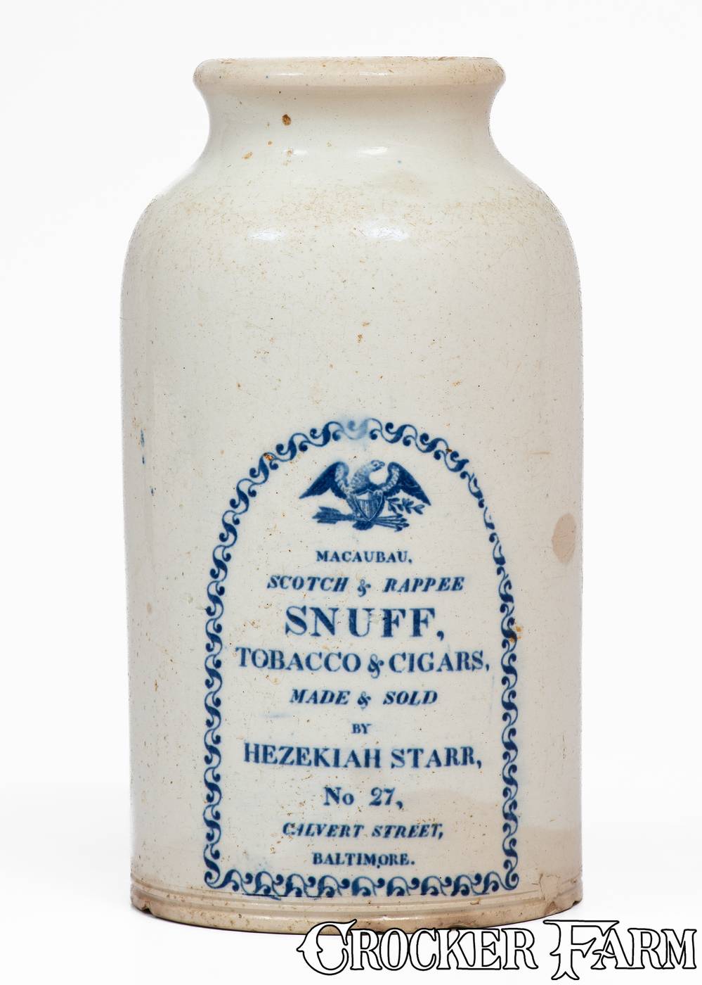 Very Rare CLEWS'S MANUFACTURER'S Snuff Jar for Baltimore Merchant Hezekiah Starr, c1812