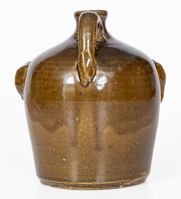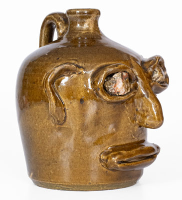 Extremely Rare Alkaline-Glazed Stoneware Face Jug with Rock Eyes and Teeth, attributed to Cheever and Lanier Meaders, Cleveland, GA, circa 1967, ovoid jug with semi-squared spout, decorated with a hand-modeled and applied clay face featuring large rock eyes set within protruding lids, curved ears, rounded nose, and broad, slightly-open mouth. Light depressions on the front and side of jug mimic the structure of the human face. Surface covered in a mottled olive-green alkaline glaze with high gloss. The large rock eyes include this glazing with some areas omitted on the proper right eye, revealing visually-appealing iron oxide inclusions inherent to the quartz. A collaborative work by father, Cheever, and son, Lanier, this work was made when The Smithsonian purchased over two-hundred Meaders jugs to be sold at their Folklife Festival in 1967. A significant new discovery from Lanier Meaders's earliest years of face jug production. Provenance: A recently-surfaced example, acquired by the parents of the consignor at the Smithsonian Folklife Festival in 1967. A minor in-the-firing chip to proper right handle, which is lightly glazed over. Some colored filler added to an in-the-firing separation to left edge of lid of proper left eye and underside of left eye, likely added at the pottery prior to sale. H 8 3/4".