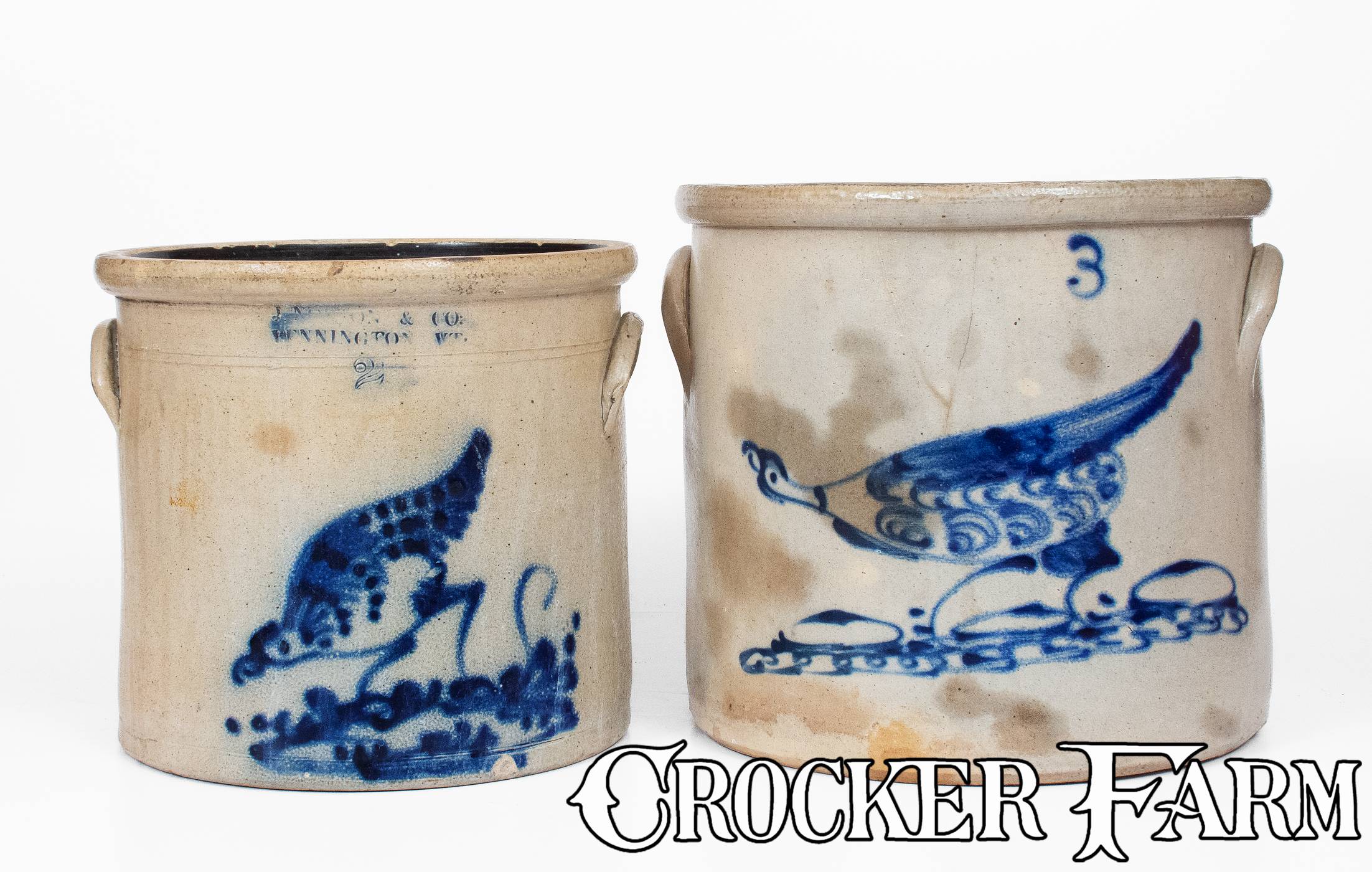 Two Stoneware Crocks with Cobalt Chicken Decorations, Northeastern origin, circa 1850-1860, a two-gallon cylindrical crock stamped "J. NORTON & CO. / BENNINGTON, VT," circa 1850, decorated with a slip-trailed design of a chicken with spotted tail and heavily-shaded body, pecking kernels of corn from a grassy lawn. Together with a three-gallon cylindrical crock, Albany, NY origin, probably R. O'Connell Pottery, circa 1860, decorated with a large brushed and slip-trailed design of a chicken with heavily-shaded wing and elaborate semi-circular feathers atop a stylized ground. Slip-trailed "3" to shoulder. Norton crock with rim chips, base chip, and heavy damage to reverse and underside including flaking, cracks, and reglued wedge-shaped section at base. Albany crock with 2" x 4" reglued wedge at rim on front, an 8" crack up from base on right side which extends to underside, staining, other minor damage including hairline from rim on right. H (of Albany crock) 10 1/4".
