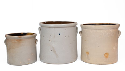 Three Stoneware Crocks with Cobalt Dates, Northeastern U.S. origin, second half 19th century, all three cylindrical crocks, the first stamped "HAXSTUN & CO. / FORT EDWARD, N. Y." decorated with a slip-trailed wreath surrounding the date "1876"; the second stamped "OTTMAN BRO'S / FORT EDWARD, N.Y." decorated with a slip-trailed wreath surrounding the date "1881"; the third stamped "F. B. NORTON & CO / WORCESTER MASS" decorated with an elaborate slip-trailed design of crossed leaves accented with spirals, surrounding the date, "1868." H (of tallest) 12 7/8". 1876 crock with repaired right handle, scattered filled flaking, mostly on right side, other lesser damage including flaking on underside. 1881 crock with rim chip and flaking throughout, some deep. 1868 crock with top-to-bottom crack to right of decoration, interior rim chips, and scattered light flaking, mostly towards base. H (of tallest) 12 3/4".