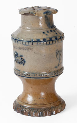 Extremely Rare Cobalt-Decorated Stoneware Presentation Bank with Incised Bird and Floral Motifs and Molded Lion, Stamped "DONATION / FOR.THE.THIRD / INTEREST" and "MISS.EMMA.MURRAY.," Northeastern U.S. origin, mid 19th century, extravagantly-potted, cylindrical form on scallop-edged pedestal base with narrow collar above, surmounted by a flattened top with crimped rim. Body decorated on front with molded, impressed, and incised drapes flanking the inscription, "DONATION / FOR.THE.THIRD / INTEREST." Sides decorated with incised bird and floral motifs. Reverse decorated with a molded standing lion below the name, "MISS.EMMA.MURRAY." Collar embellished with pierced star and circle designs surrounding a molded star. Large coin slot to shoulder area, underscored by a series of impressed X's. Edges of bank feature chip carving, dentile incising, and impressed circles, and key tips. Cobalt highlights throughout as well as a brushed floral motif to base and swag design to body. This imaginative work, which employs a wide variety of decorative techniques, is among the most ambitiously-crafted stoneware banks that we have ever offered. Losses to small piece applied to top of bank, possibly in-the-making. Losses to crimped rim. A 3/4" base chip. H 8 1/4".