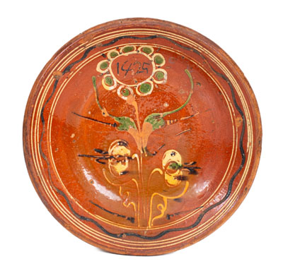 Scarce Eastern PA Redware Dish w/ Elaborate Three-Color Slip Floral Decoration, Dated 1825