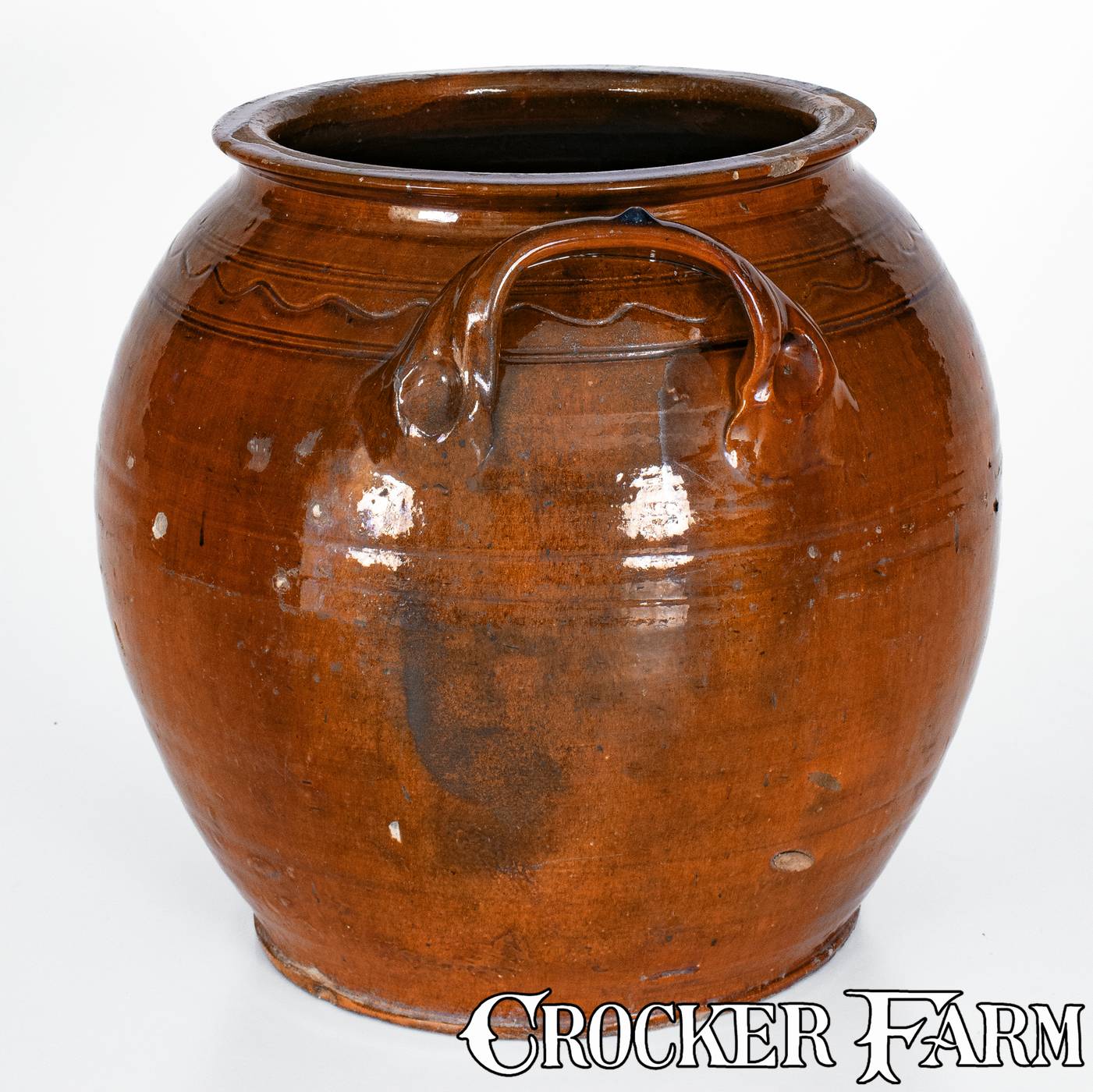Extremely Rare Glazed Redware Jar, Inscribed "Henry Watkins / 1852," Guilford or Randolph County, North Carolina origin, 1852, squat-shaped, ovoid jar with thin flaring rim, wide strap handles with depressed terminals, and incised sine wave decoration to shoulder, the surface covered in a streaky, colorful lead-and-manganese glaze. Underside incised in very large script "Henry Watkins / 1852". Featuring an excellent form with delicate potting, this jar is one of only a few signed examples of this potter's work known. Watkins's life and career are discussed in Hal E. Pugh and Eleanor Minnock-Pugh's Ceramics in America 2010 article, "The Quaker Ceramic Tradition in Piedmont North Carolina." He was born in Randolph County, North Carolina in 1789 or 1799 and possibly apprenticed to William Dennis or his son, Thomas, living only two miles from the Dennises and attending the same Quaker meeting. In 1837, he moved to Guilford County, and, according to census records, was making pottery there in 1850, only to move back to Randolph County by 1860. In May 1863, he was one of ten neighbors who signed a petition to Jefferson Davis seeking to exempt potter, Himelius Hockett, his brother Jesse, and two other Quakers from having to serve in the Confederate Army. All were being held in a Confederate prison in Kinston, North Carolina, after refusing to bear arms" (Pugh and Minnock-Pugh, p. 76). A particularly fine example of signed North Carolina redware. Literature: For more information on Watkins, see Pugh and Minnock-Pugh, "The Quaker Ceramic Tradition in Piedmont North Carolina," Ceramics in America 2010, pp. 75-76. Provenance: Previously surfaced in North Carolina; purchased by Wahler at Crocker Farm, Inc., March 30, 2012, lot 353. Overall excellent condition for a redware example of this age and origin. A few rim chips, a base chip, and some scratches to surface of glaze. H 11 1/4".