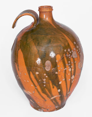 Exceptional Copper-Decorated Redware Jug, attributed to Christopher Alexander Haun, Greene County, TN, circa 1840-1860, finely-potted, highly-ovoid jug with tooled shoulder, coved spout molding, and broad, heavily-ribbed strap handle, the lead-glazed surface lavishly-decorated throughout with large copper runs against a light-orange ground. Beautifully-glazed with dramatic copper application in the Haun style, this jug is also noteworthy for its extraordinary, seven-ribbed handle, which measures 2 5/8" wide. The jug's refined potting and colorful glaze led it to be chosen for the cover of Wahler's book, Tennessee Turned, Earthenware and Stoneware Made in East Tennessee 1800-1900, Part One. Exhibited: Tennessee Turned, Earthenware and Stoneware Made in East Tennessee 1800-1900, Museum of East Tennessee History, May 16-October 30, 2011. Christopher Alexander Haun (1821-1861) was a Union sympathizer during the Civil War who, on November 8, 1861, participated in the burning of a Confederate railroad bridge along Lick Creek in Greene County, Tennessee. Convicted of treason and hanged by the Confederacy, Haun left behind a moving letter to his wife, Elizabeth, instructing her to have fellow potters "fishing off [his] ware ... for [her] support." Haun is regarded today as Tennessee's most gifted potter and revered as a man of principle who died for the Union cause; more about this remarkable figure in the history of American ceramics is available in our description for Lot 29. Literature: Illustrated in Wahler, Tennessee Turned, Earthenware and Stoneware Made in East Tennessee 1800-1900, Part One, cover, p. 70, fig. 70, p. 201, and p. 230, pl. 15. Large lower section of handle missing. Flakes throughout. Significant cracks to front and sides. Base with some flakes and a few small chips. A minor chip to top of spout. H 15".