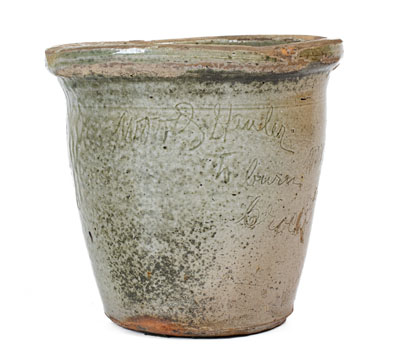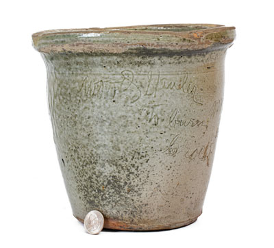 Possibly Unique Salt-Glazed Stoneware Jar with Elaborate Incised Inscription, Daniel Mayner at the Moses P. Harmon Pottery, Greene County, TN, 1890-1900, semi-ovoid jar with tooled shoulder and thick, semi-rounded rim, featuring the elaborate incised inscription, "Wood Hauler / to burn / Crocks / wood / hauler / Daniel Mayner / Pottertown / teamster." Surface covered in thick, light-green salt glaze. Perhaps one of the most wonderfully-inscribed pieces of Tennessee pottery known, this work serves as a bold proclamation of the pottery duties of Daniel Mayner while working for Moses P. Harmon. Exhibited: Tennessee Turned, Earthenware and Stoneware Made in East Tennessee 1800-1900, Museum of East Tennessee History, May 16-October 30, 2011. Literature: Illustrated in Wahler, Tennessee Turned, Earthenware and Stoneware Made in East Tennessee 1800-1900, Part One, cover, p. 77, fig. 83, p. 119, pl. 17, p. 205, fig. 83. According to Wahler, Mayner, along with his father and brother, hauled wood for the M.P. Harmon pottery (Wahler, p. 204). An approximately 3" x 2 3/4" flake on interior leading to a 3/4" hole with small flake on exterior, formed to convert the jar into a flowerpot. A 1 1/8" rim chip. Four in-the-firing kiln furniture marks to rim, three of which appear as chips. A 2 3/4" hairline on underside, continuing 2 1/4" diagonally up base. A 1" diagonal in-the-firing surface fissure at base, not visible on interior. H 8".