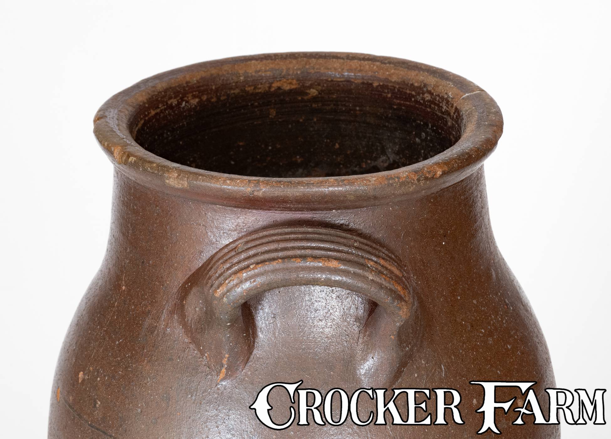 Salt-Glazed Stoneware Jar, attributed to the Hinkle-Mort Pottery, Jefferson County, TN, circa 1850-1870, ovoid jar with tall collar, flared rim, and heavily-ribbed handles with depressed terminals. In her notes, Wahler states, "Sherds from the Jefferson County site exactly match the handles, glaze and body. . . Steve and Sam have found that Aaron Mills was potting at this site around 1860. I believe this piece is before his time. . . I have purchased another jar '06 which is a match except for a wider mouth. Same potter. Another of this form with these handles sold at Case 2011 while this exhibit was ongoing. It came from the Mort family who lived on site." Exhibited: Tennessee Turned, Earthenware and Stoneware Made in East Tennessee 1800-1900, Museum of East Tennessee History, May 16-October 30, 2011. Literature: Illustrated in Wahler, Tennessee Turned, Earthenware and Stoneware Made in East Tennessee 1800-1900, Part One, p. 93, fig. 97, p. 206, fig. 97. Rim chips. Two thin cracks from rim, measuring 4 1/4" and 2 3/4". Both handles with small chips and wear. A crack across underside, extending 2 1/2" up base in one place and forming a 5 1/2" Y ascending base elsewhere. Shallow chipping to base. Some surface wear. H 12 3/4".