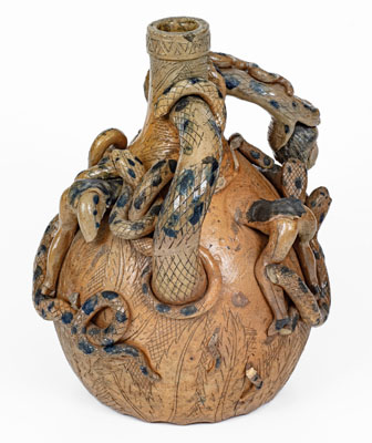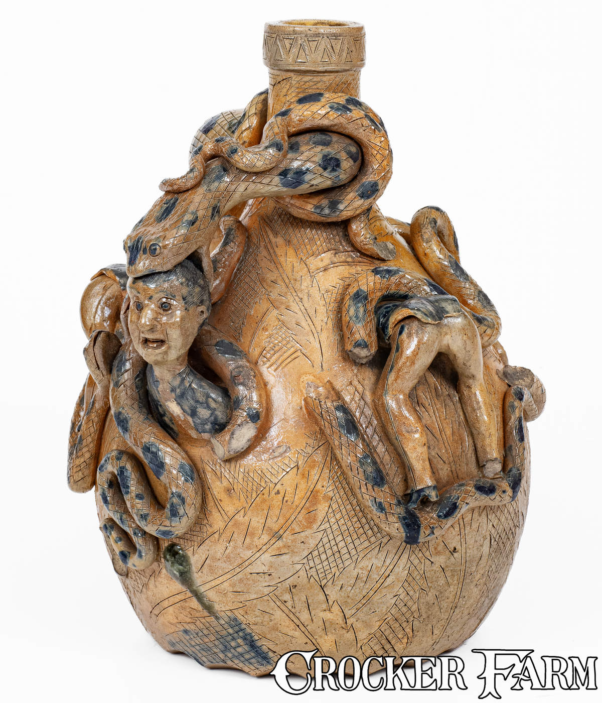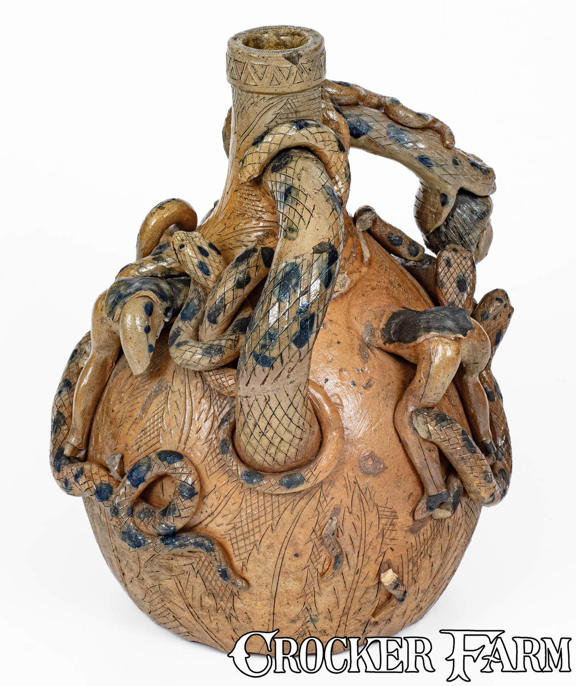 Important Anna Pottery Salt-Glazed Stoneware Temperance Jug with Incised Figural and Brushed Cobalt Decoration, Signed "Anna Pottery / Anna Ills," Wallace and Cornwall Kirkpatrick, Anna, IL, circa 1880, orb-shaped jug with tall spout and squared mouth, decorated with ten hand-modeled snakes applied in various slithering and coiled poses around the body of the jug, the handle in the form of a large snake with gaping mouth devouring the torso of man protruding from the vessel's front. Three other coated figures, seemingly trapped headfirst inside the jug, protrude from the wall of the vessel around its midsection. Replete with intricate detail, this creation includes painstakingly incised scaling throughout the snakes' bodies, incised seams along the garments of the figures, and delicate incised and modeled features to the central figure (down to incised teeth and tongue) accurately conveying the anguish engendered by his situation. This jug takes its overwhelmingly decorative focus a step further with a rare treatment of extravagant incised leaves and crosshatching canvassing the body of the jug, incised triangle and coggled crosshatching at the spout, and scalloped chip carving to the base. The piece is finished with brushed cobalt spotting throughout the snakes, highlights to their eyes, and highlights throughout the applied human figures, all under a clear salt glaze. This exquisitely-decorated masterwork showcases the Kirkpatrick brothers' amazing ability to bring clay to life. Distinguished by its abundance of snakes, over-the-top incised decoration, and desirable salt-and-cobalt glaze, this jug survives as an exceptionally fine example of the Kirkpatricks' ingenious workmanship. A cornerstone piece from the collection of noted folk art enthusiasts, George H. Meyer and Kay White Meyer, this lot will include a copy of their book, Early American Face Jugs, in which it is featured. Exhibited: "Early American Face Jugs from the George H. Meyer Collection," Fenimore Art Museum and South Carolina State Museum, 2019-2021. Literature: Illustrated in Meyer and Meyer, Early American Face Jugs, pg. 184. Provenance: Sotheby's Sale 7085, lot 1806, 1989; Ex-George H. Meyer and Kay White Meyer Collection. Large losses to applied decoration, typical of this form. A small spout chip. A 4 1/2" firing crack to underside. H 10 1/2".