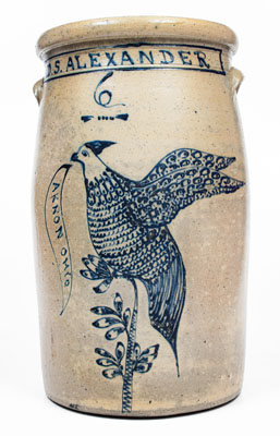 Exceptional Six-Gallon Stoneware Presentation Churn with Elaborate Cobalt Decoration of a Grouse with Banner, Inscribed "AKRON OHIO," Inscribed "D.S. ALEXANDER," John Park Alexander Pottery, Akron, OH origin, circa 1870, semi-ovoid churn with tooled shoulder, semi-rounded rim, and arched lug handles, decorated with a large slip-trailed design of a crested grouse with spread wings, perched on a leafy branch, carrying a banner or speech bubble in its beak, inscribed "AKRON OHIO." The decoration includes remarkable detail throughout, including spotted ovals in the tail resembling peacock-eye feathers, additional dotted scalloping to the neck, heavy scalloping throughout the body, and stripes in the tail. Slip-trailed "6" above with flourish below. Inscribed with the slip-trailed name, "D.S. ALEXANDER," within a rectangular border below rim. Includes salt-glazed lid of Ohio origin. This masterwork of Ohio stoneware is noteworthy for the size, detail, and subject matter of the decoration, and addition of the name of its owner. Its grand design features excellent coverage over the vessel's front, spanning 12 1/2" tall by approximately 11" around the curve of the vessel's front. In addition, the depiction of the bird with both a sense of motion, alighting the branch with raised wings, and carrying a banner in its beak emblazoned with the name of its city of origin, are rarely-seen treatments. The name, "D.S. ALEXANDER," refers to David Alexander, a farm implements dealer and older brother of Akron pottery owner, John Park Alexander. A monumental jug-form cooler with bird likely by the same hand, bearing the inscription, "HARLEY & CARLL / AKRON / O / ALEXANDER / STONEWARE / MANUFACTURER / 1876 / CENTENNIAL," was famously featured on the PBS series, Antiques Roadshow, in June 2004, appraised by folk art dealer, Allan Katz. Among the finest examples of Ohio stoneware that we have ever offered. Literature: Illustrated in Treichler, A History of Northeast Ohio Stoneware, pg. 55. Provenance: Originally found circa 1974 among household goods that were to be discarded from the home of an Akron, Ohio woman moving into a nursing home; Blair Auctions, Ohio, May 2004; Waasdorp Auctions, Clarence, New York, September 2004, lot 209; Garths' Auctions, Delaware, Ohio, May 18, 2012, lot 74. Churn with two cracks from rim on reverse, measuring 7 1/2" and 5". A few minor chips to interior of rim and one minor chip to inner rim for lid. A large Y-shaped surface line to underside, not visible on interior. Proper right handle with a 5/8" chip and minor nick. Minor fry to cobalt. Lid with one chip to opening. H (excluding lid) 18".