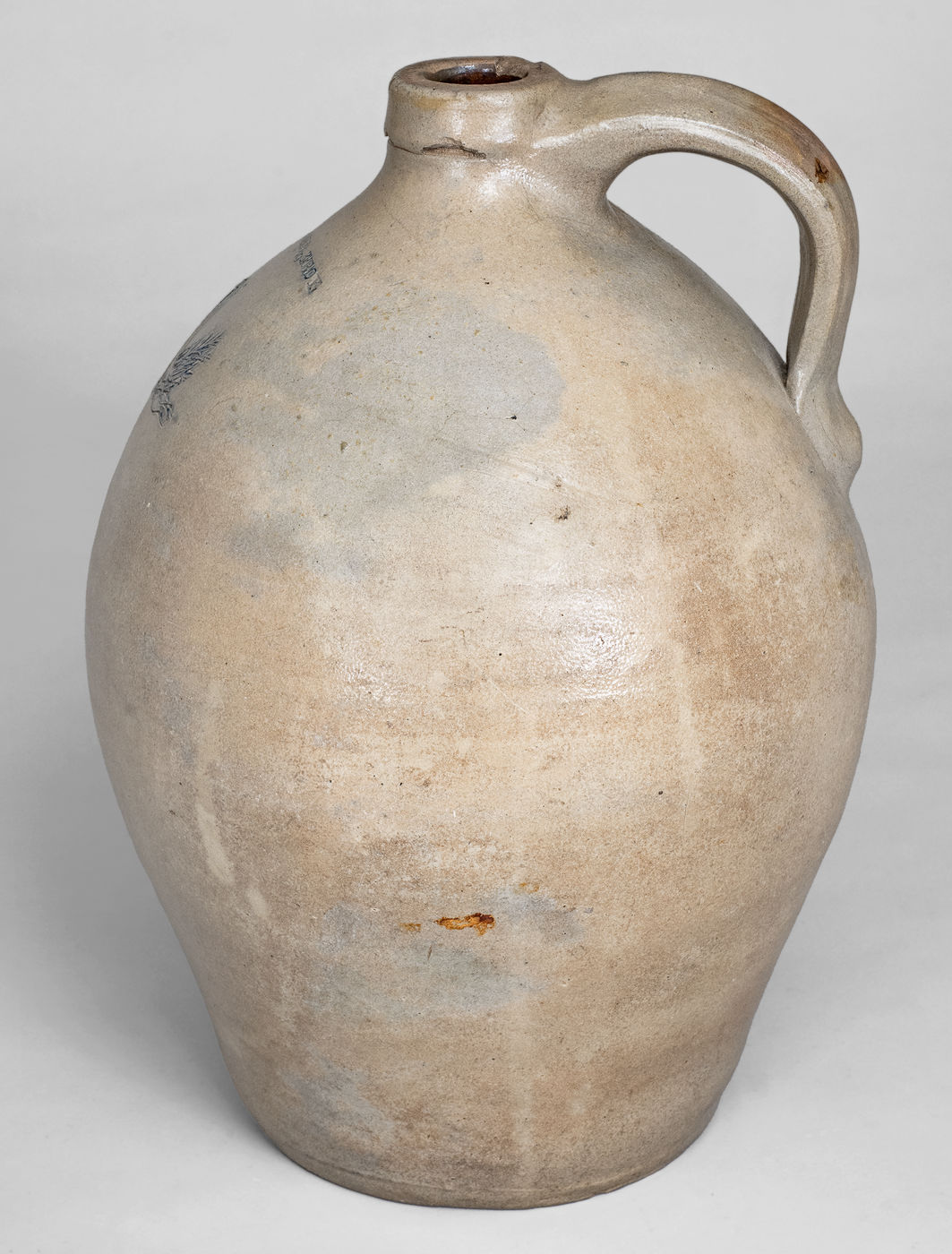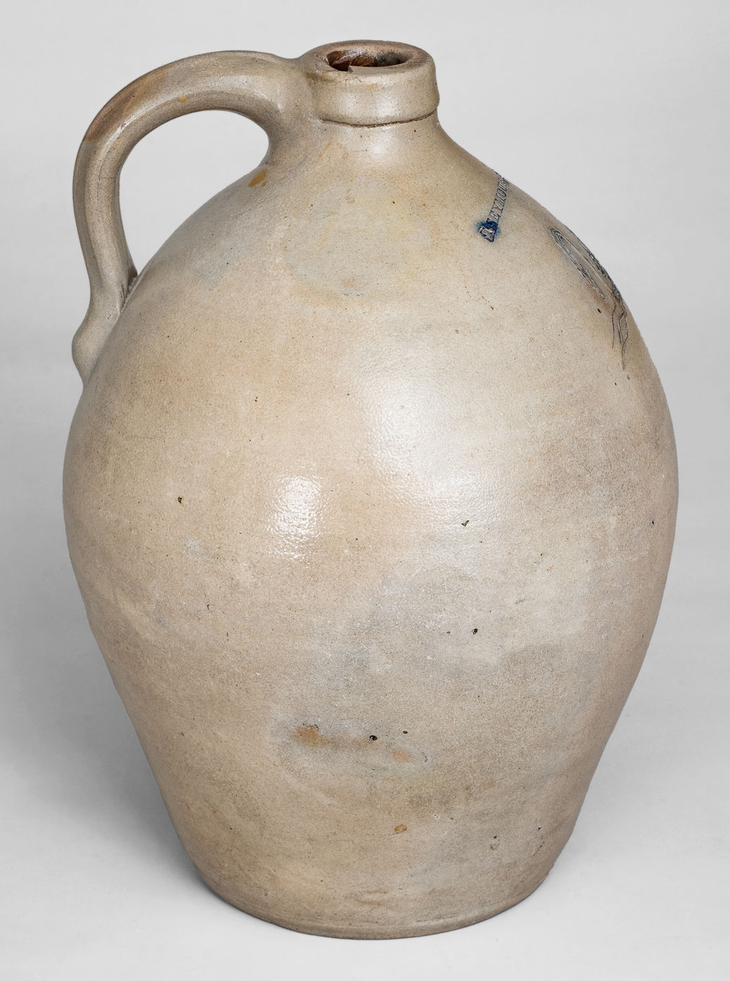 ×Ovoid I. SEYMOUR / TROY, New York Stoneware Jug w/ Incised Swan Decoration