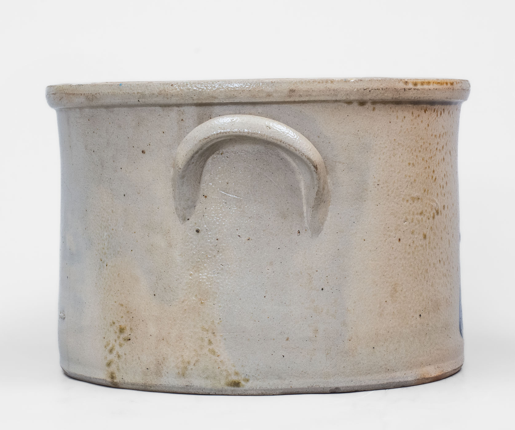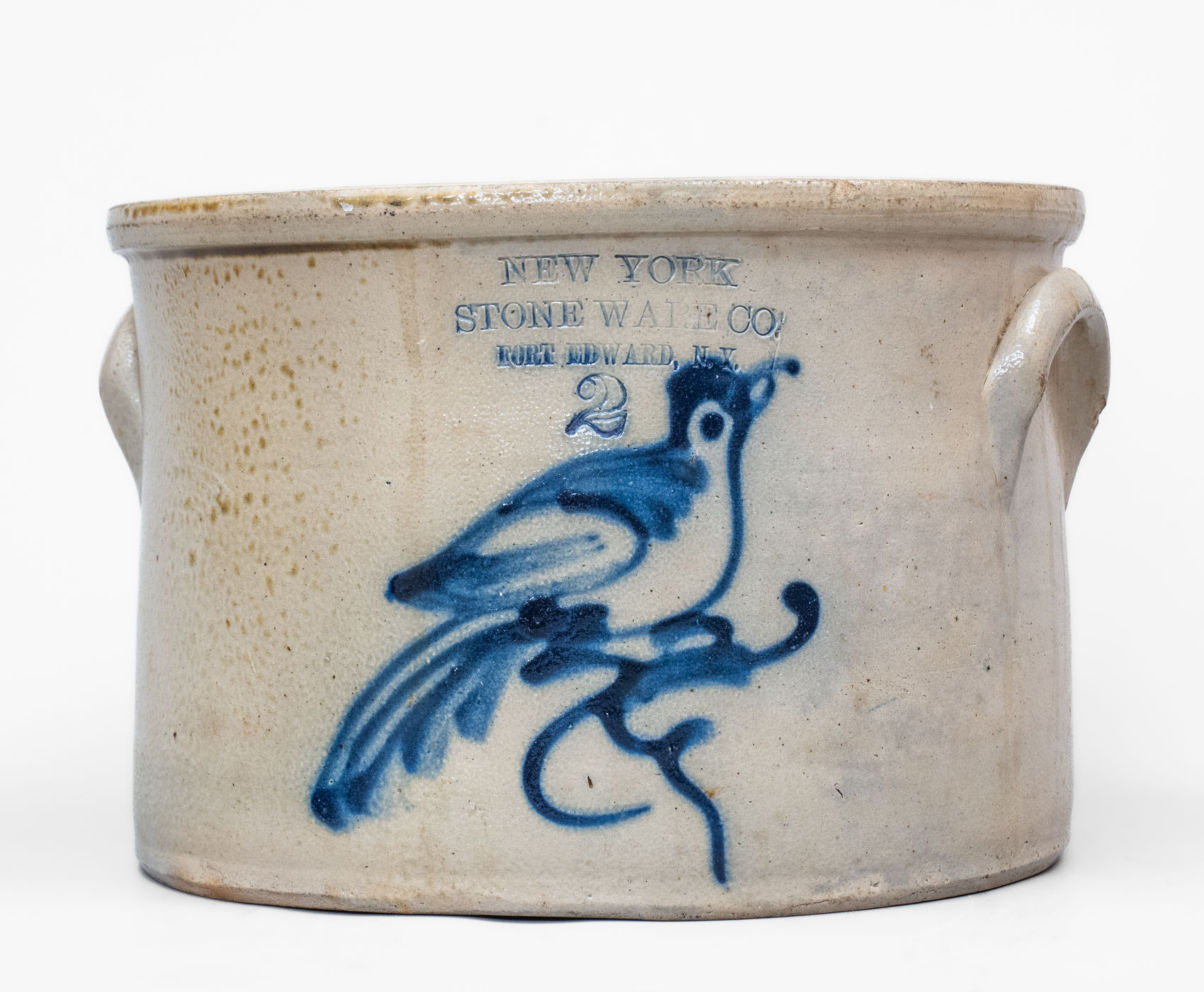 ×Unusual 2 Gal. NEW YORK STONEWARE CO. / FORT EDWARD, NY Stoneware Cake Crock w/ Bird Decoration