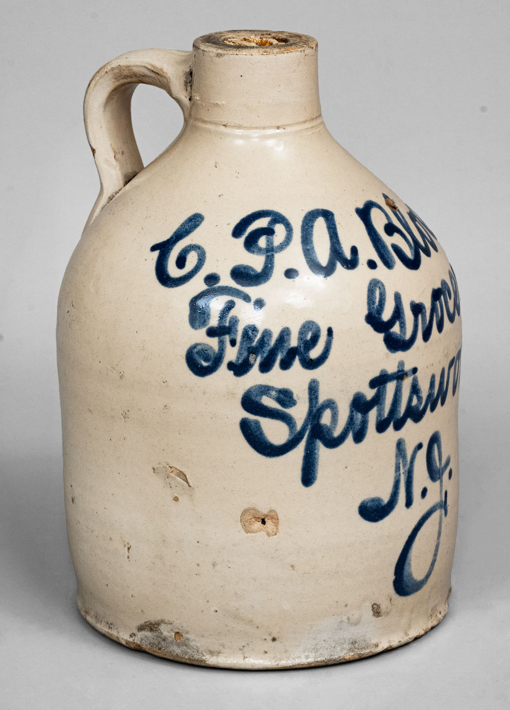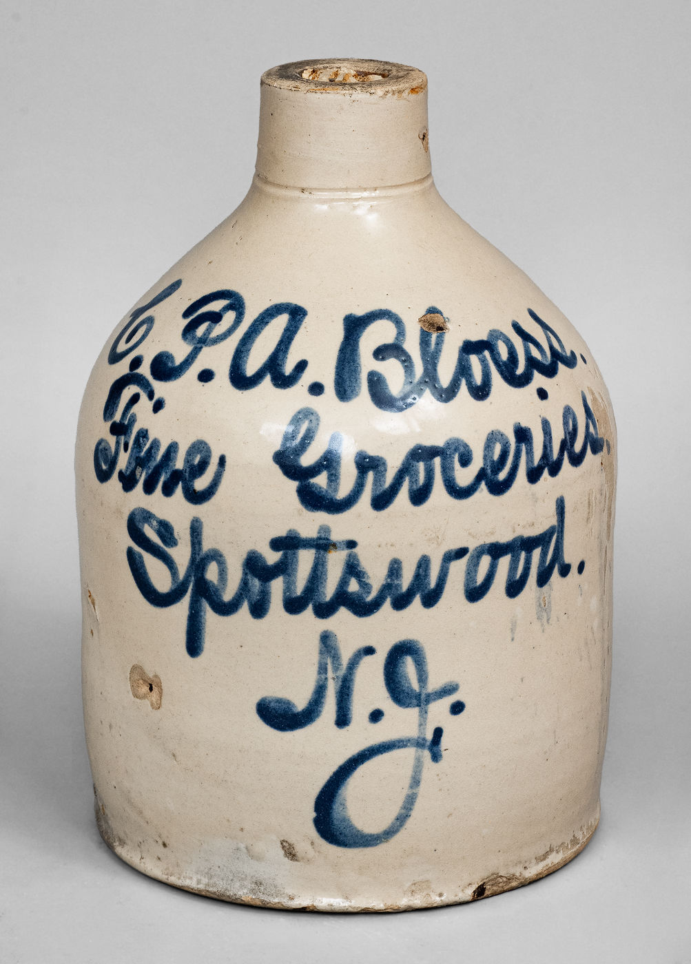 ×Rare Spottswood, NJ Stoneware Script Advertising Jug, attrib. Fulper Pottery, c1900